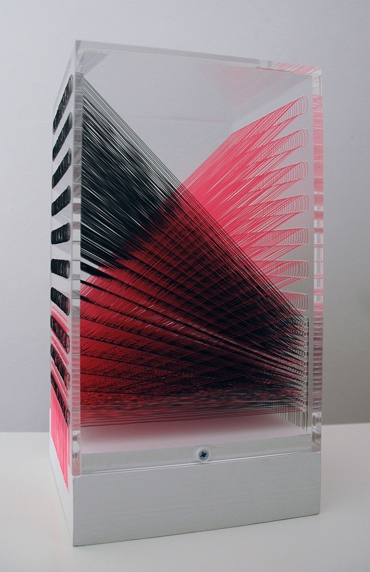 In the sculpture “9,772 Inches of Black and Red Monofilament”, Currie uses a series of threads hand-strung in grids to form angled wedges of red and black that intersect at the center, forming an area of at what – at first – looks like disorder. Upon closer inspection the consistency of the patterns becomes clear. This work has a number of mathematical connections: The careful measurement of the monofilament is a defining factor in the title for this work. Currie uses a series of grid patterns to thread the work. There are intricate geometric shapes created within the cases. The finally mathematical connection is his allusion to Chaos Theory, where there is underlying order in what at first appears to be disorder.