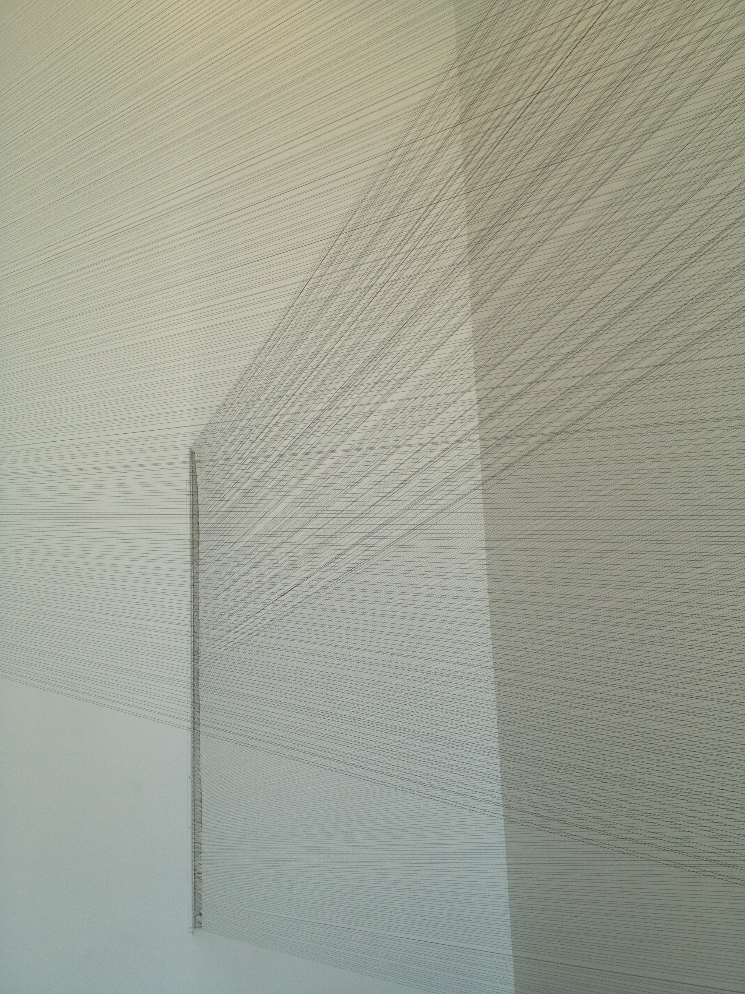 At the entrance and in the hall of the gallery, Currie has installed a site-specific thread drawing based on the architecture of the room “12 miles 1647 yards of Black Filament”. This work explores the gallery space using repetitive straight lines.