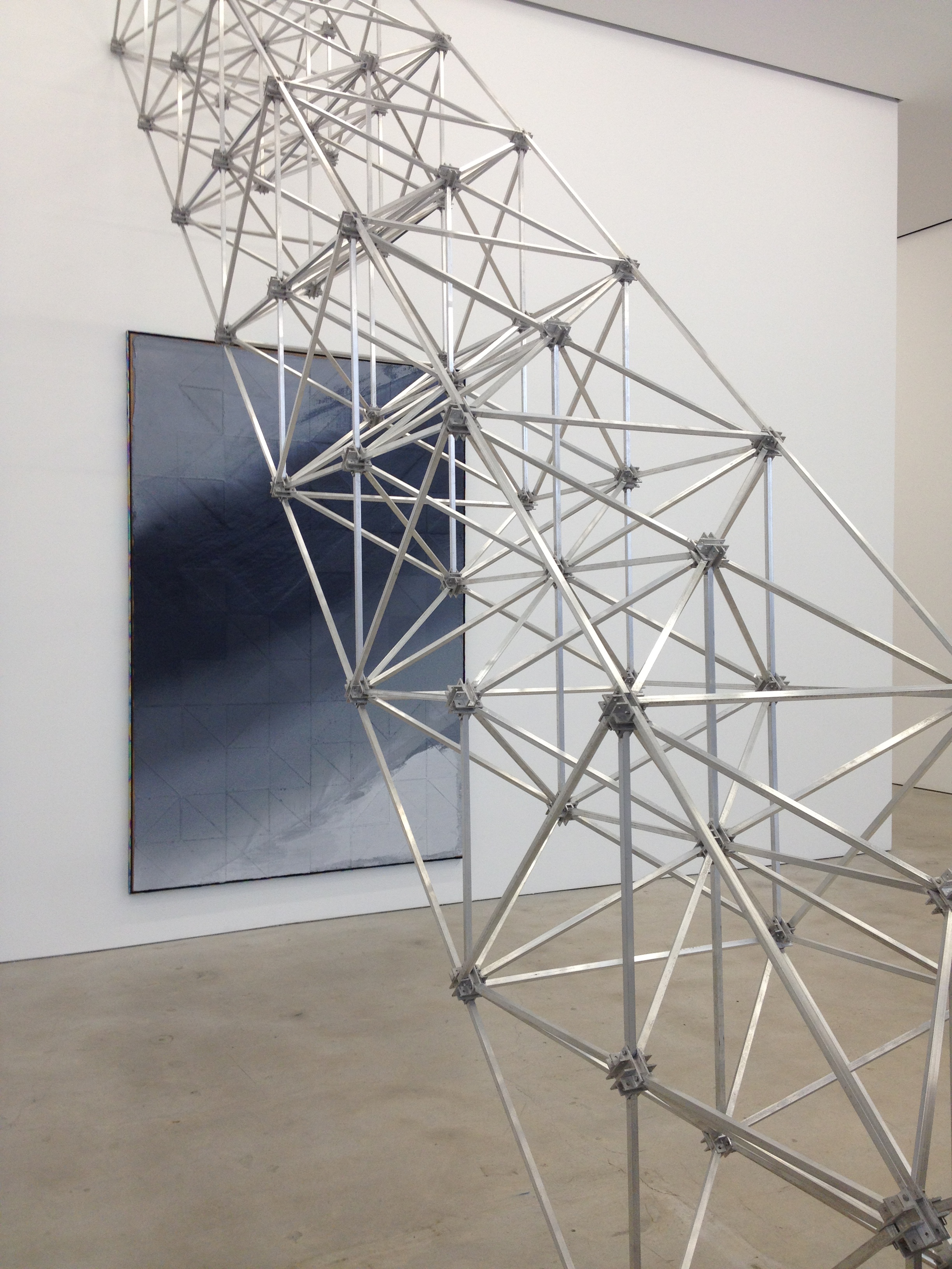 At the Marlborough Chelsea Gallery, Mark Hagen has created an aluminum and stainless steel space frame installation named “To Be Titled Ramada Chelsea #3”, that climbs in front of his “To Be Titled Gradient Painting #35”. This geometric construction features cube formations meeting at star formations formed by 12 line segments radiating out from a central point.