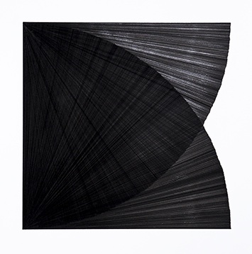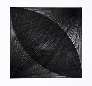 In his drawing “12X12 series #01”, Roa has drawn a multitude of equal line segments radiating out from two opposite corners of the square, creating two equal quarter circles that overlap along the diagonal.