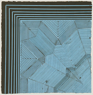Elise Ferguson uses pigmented plaster on board in her work “NW,bold”. This square work is structured using reflection or mirror symmetry. The diagonal on the square running from the upper left corner to the lower right corner is the line of symmetry. Ferguson creates a dynamic rhythm in this work through her use of parallel lines of modulating widths. The bolder set of lines parallel to the top and left edge of the board contrast with the thinner lines that are parallel to either the edges or the diagonals. There are only a few lines that are not parallel to either the edges or the diagonals. These lines divide the board into geometric regions, creating defined sections of parallel lines going in different directions. There is a hand drawn qualtity to this work that I really appreciate. I feel that the varying widths of the lines enhances the nature of the material and gives the work great energy.