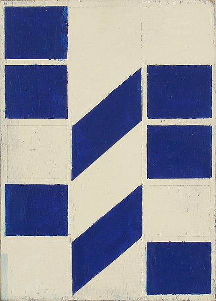 Alain Biltereyst’s intimate painting on wood panel “2/0/12” has historical references to earlier geometric abstractions from the 1960’s. With a background in graphic design Biltereyst is interested in signage in the public environment. This work brings the cultural phenomenon of text and images we see in advertising and street art and distills the geometric content to abstract paintings. He introduces the imperfections of the shapes inherent in the street and some handmade signs into the realm of the clean edge geometries of his historical influences. In “2/0/12” Biltereyst has created a rectangular grid system: three columns of five rectangular sections. The pattern in the left column has has been shifted down one rectangle and is repeated in the right column. The middle column features two parallelograms that have the same width as the rectangles in the other columns but are stretched to reach the corners at twice the height.