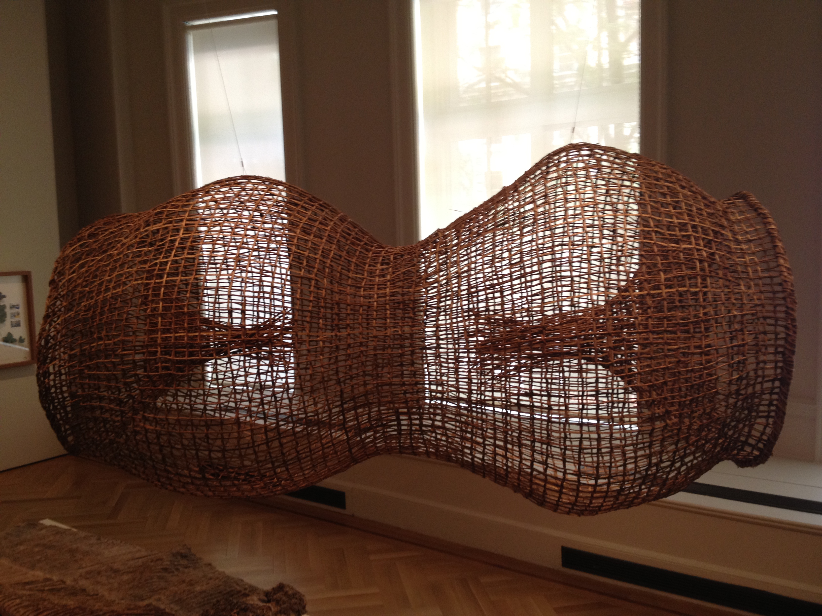 The large scale woven form “Fish Trap” (2013)  by Abel Rodriquez was created using Yare’ fiber. This form features 3-D symmetry with a central horizontal axis of rotational symmetry as well as a vertical axis of reflection symmetry. In these weavings Rodriguez has expressed the grace and elegance of form of a traditional and functional object.