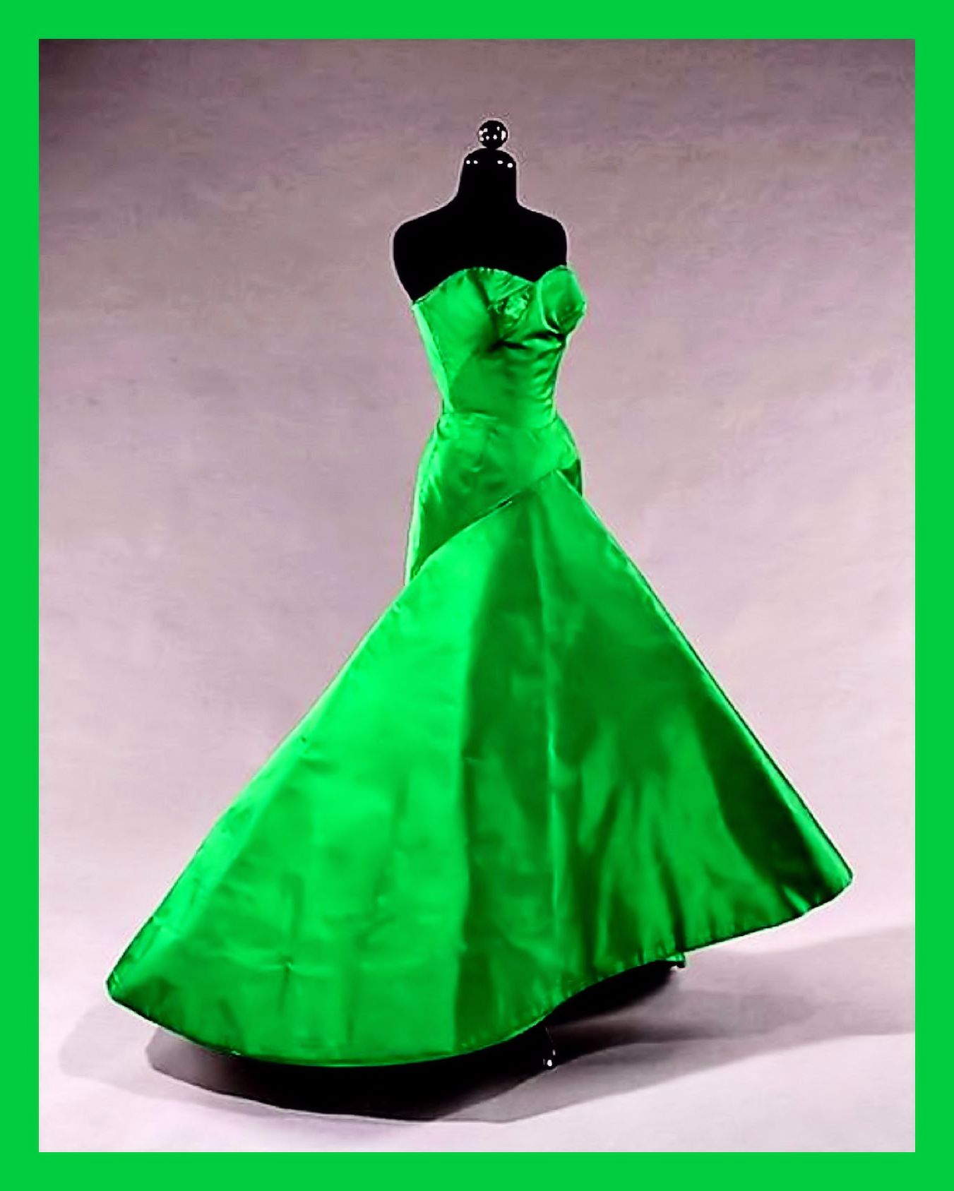 The green satin Spiral dress incorporates a spiral of fabric that seems to flow directly back into itself creating an Moebius strip that encircles the wearer.