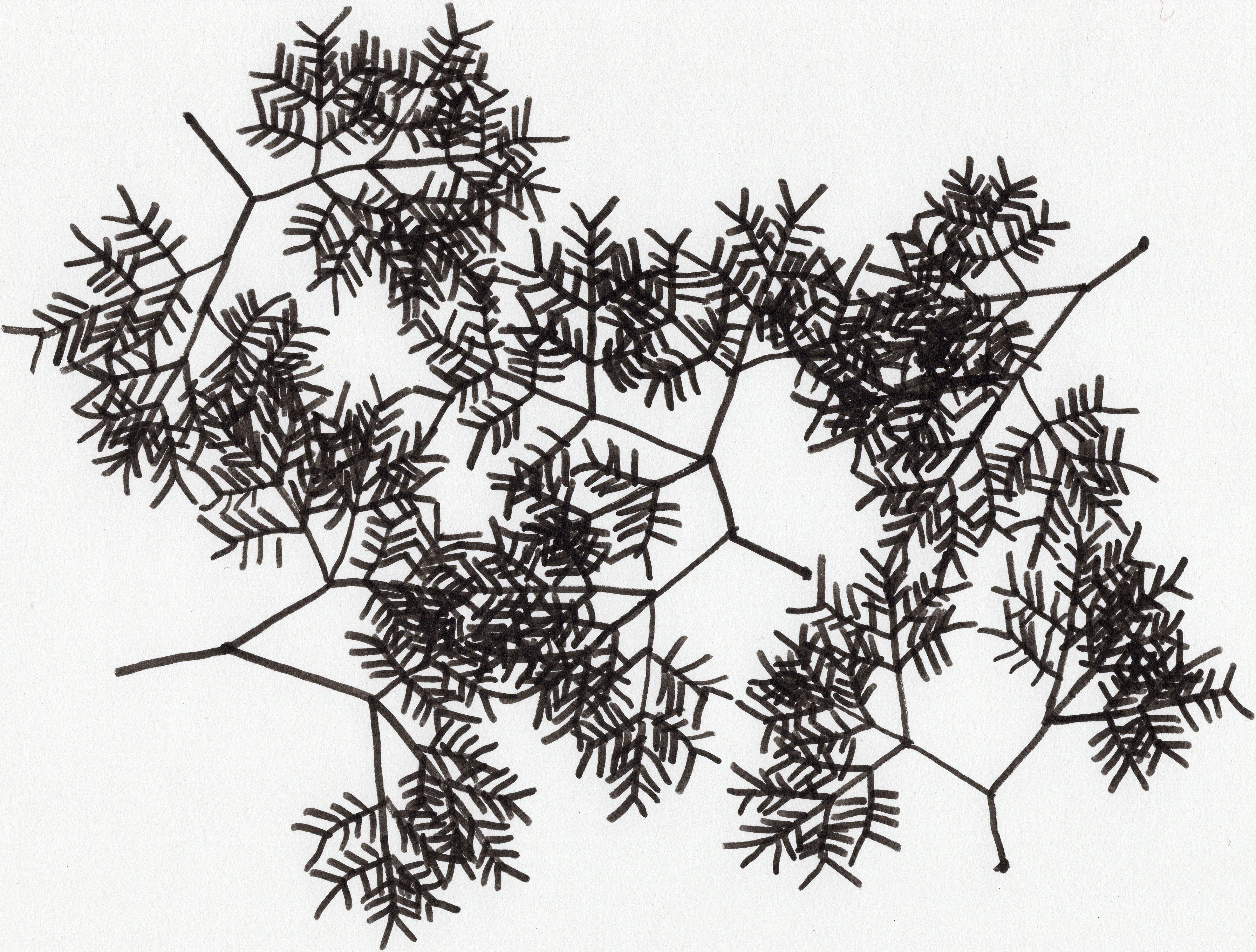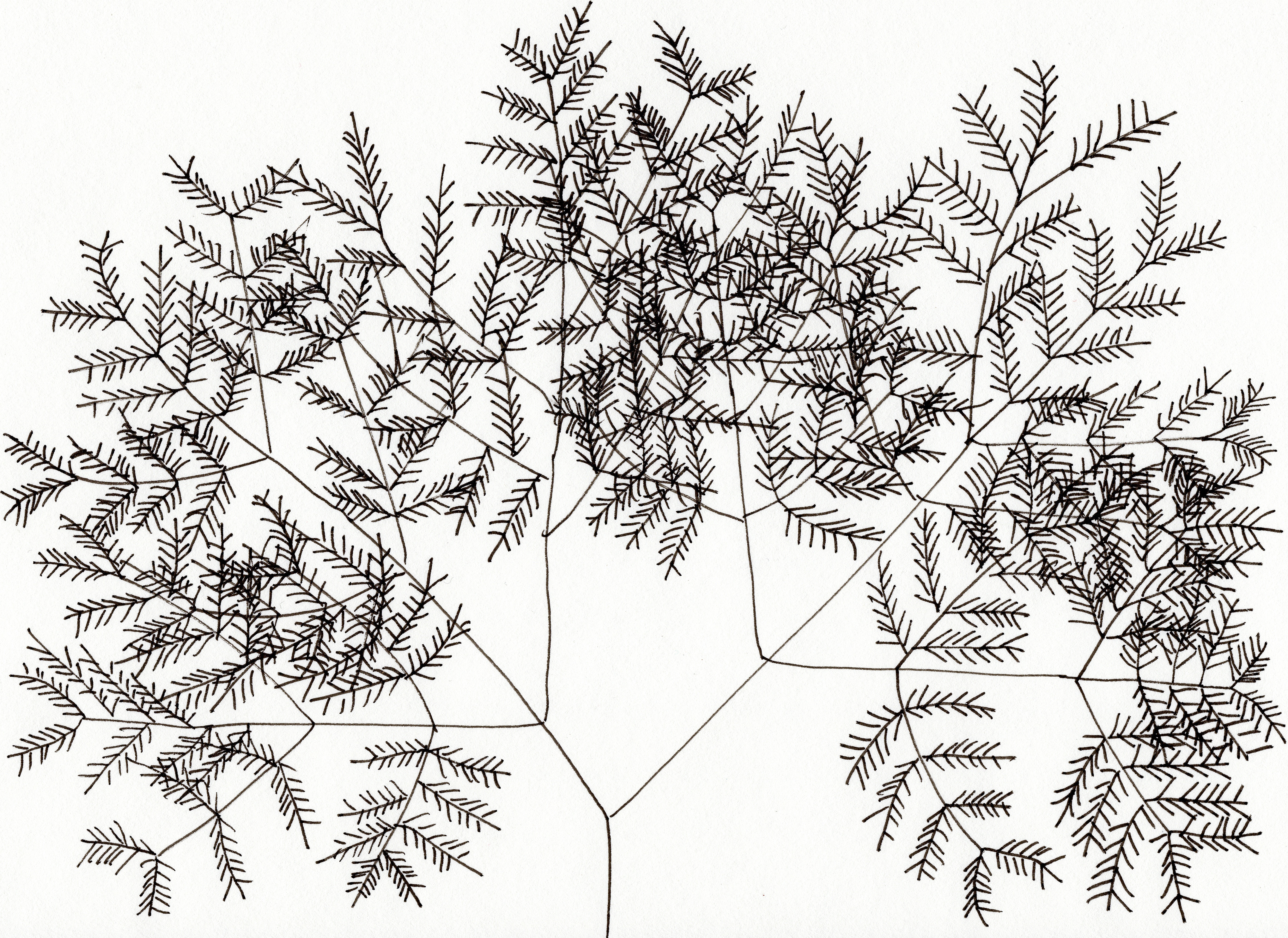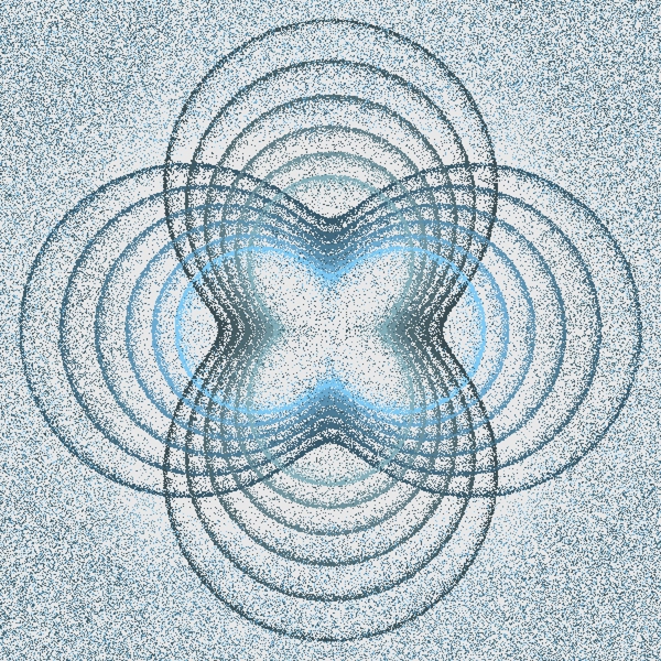 In the digital print “PCD #11863”, Greenfield starts the process with uniformly distributed grains of pigment. Then the virtual ants are instructed to carry and deposit the color on to twelve polar curves. Polar curves are curves drawn using the polar coordinate system. This is a 2-D coordinate system like the Cartesian coordinate system, but instead of having two axis to define the placement of a point on the plane, the Polar Coordinate system uses a single fixed point, an angle from a fixed direction, and the distance from the initial point, to determine the placement of the point. For this particular painting Greenfield used the formula