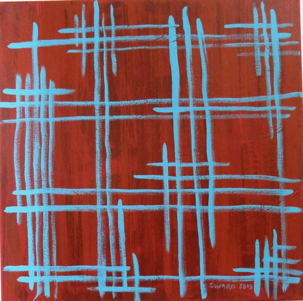 Some of the most abstract and gestural art on view was by the painter Suman Vaze. Her canvas “Ryoanji III” is an expression of the balance found in a 4 by 4 magic square. It is divided into a 4 by 4 invisible grid, and the number of horizontal and vertical lines going through a section of the canvas represents the number that would go in the corresponding square of the magic square.