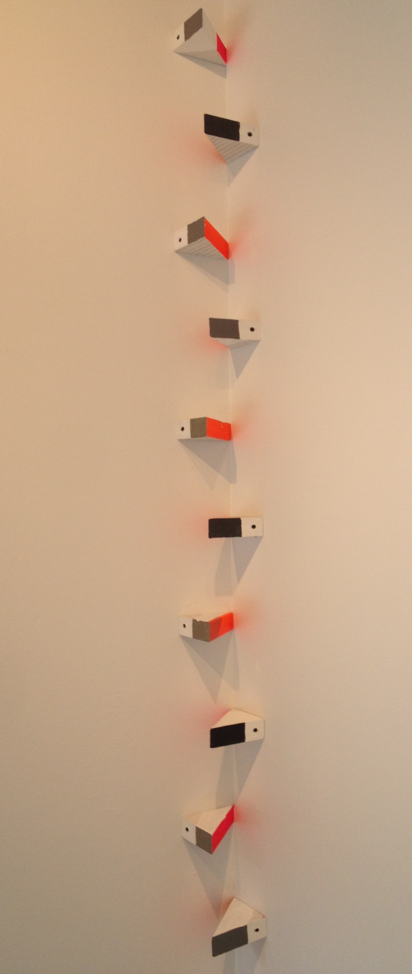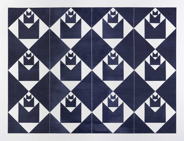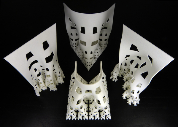 In the sculptures Untitled (Navy) and Untitled (Neon) the French fold technique creates horizontal valley folds running through the centers. The top portion of each sculpture shows a vertical hill fold through the center, and the bottom half has a vertical valley fold through the center. Disregarding the fold directions both sculptures have two lines of reflection symmetry, vertical and horizontal.
