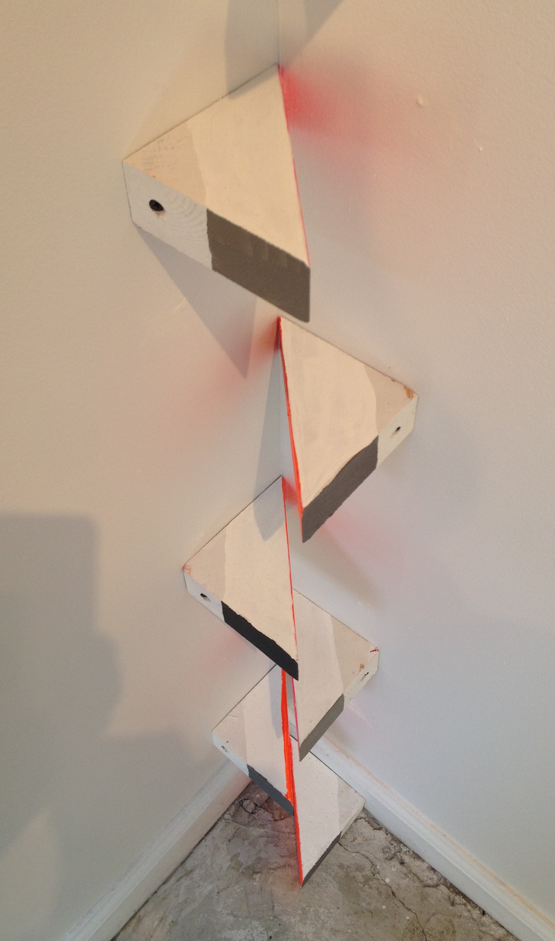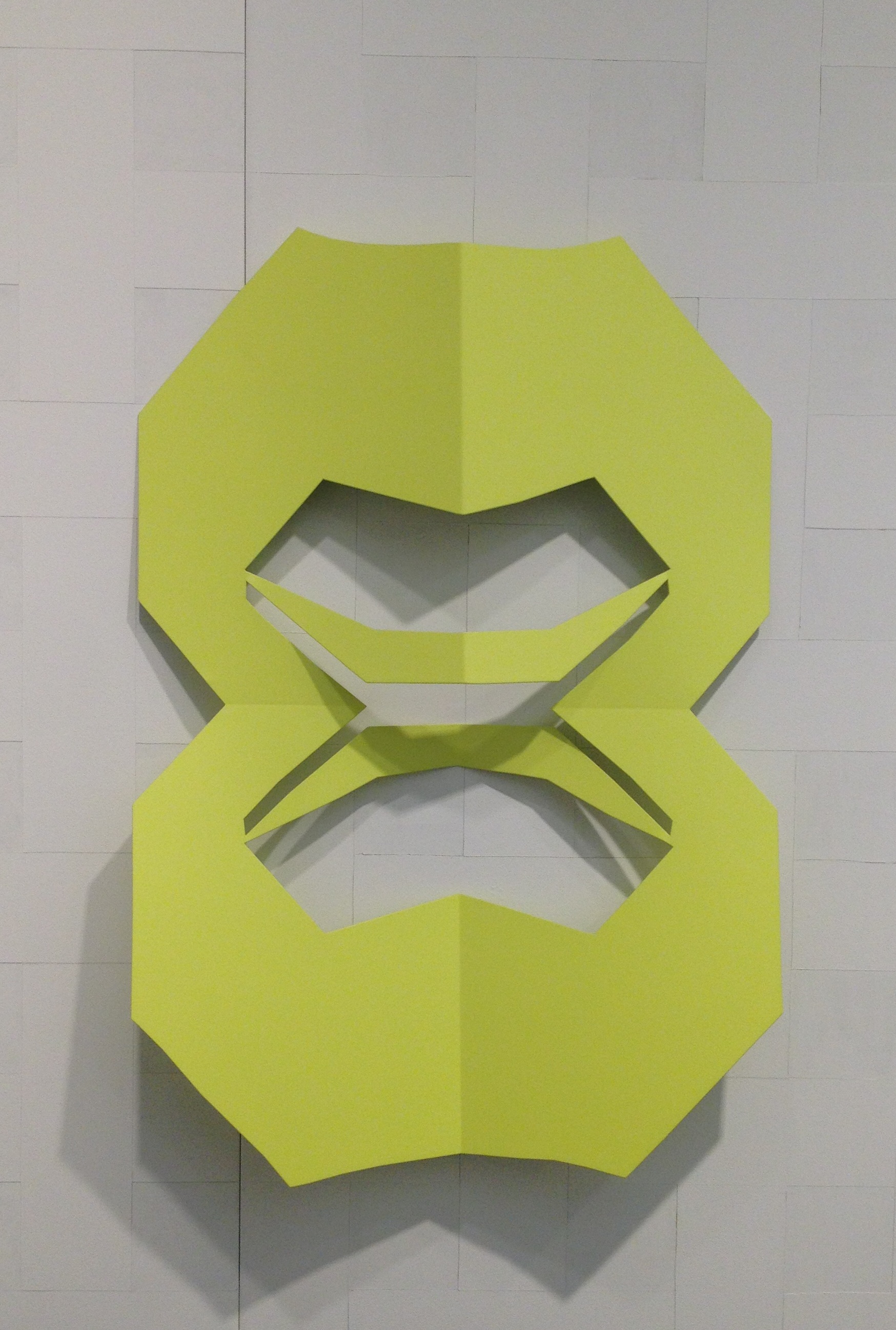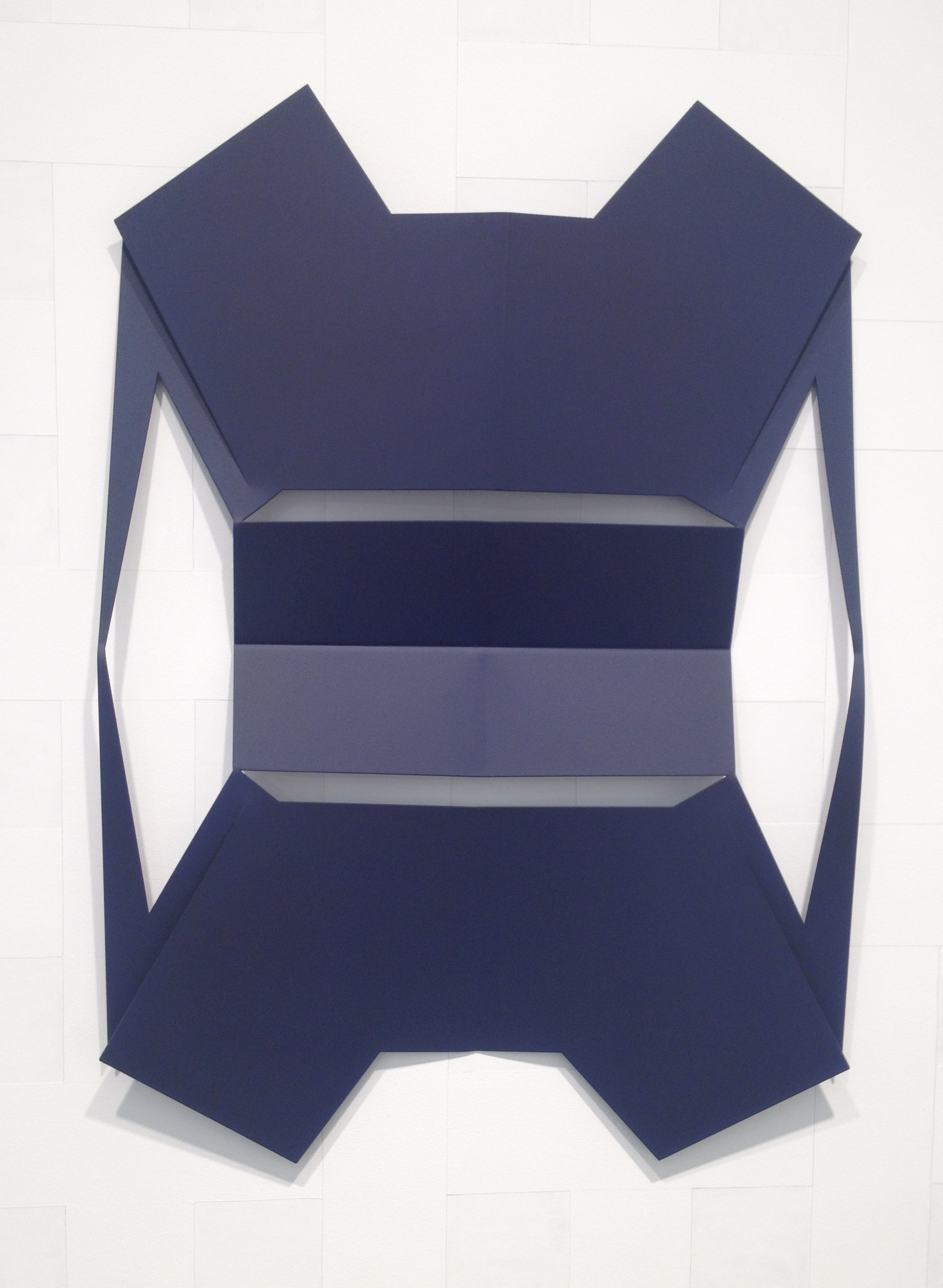 The Andrea Rosen gallery in NYC is exhibiting the work of Matt Keegan. I found two of the powder coated steel wall sculptures of particular interest. These structures originate as folded paper cut-outs that are then fabricated in steel. The type of fold that is used to make the paper forms is called a French fold. To make a French fold you take a sheet of paper and fold it in half. Then without opening the paper you fold it in half again perpendicularly to the first fold. When you unfold the paper you have two types of folds: valley folds, which are concave, and hills folds that are convex.