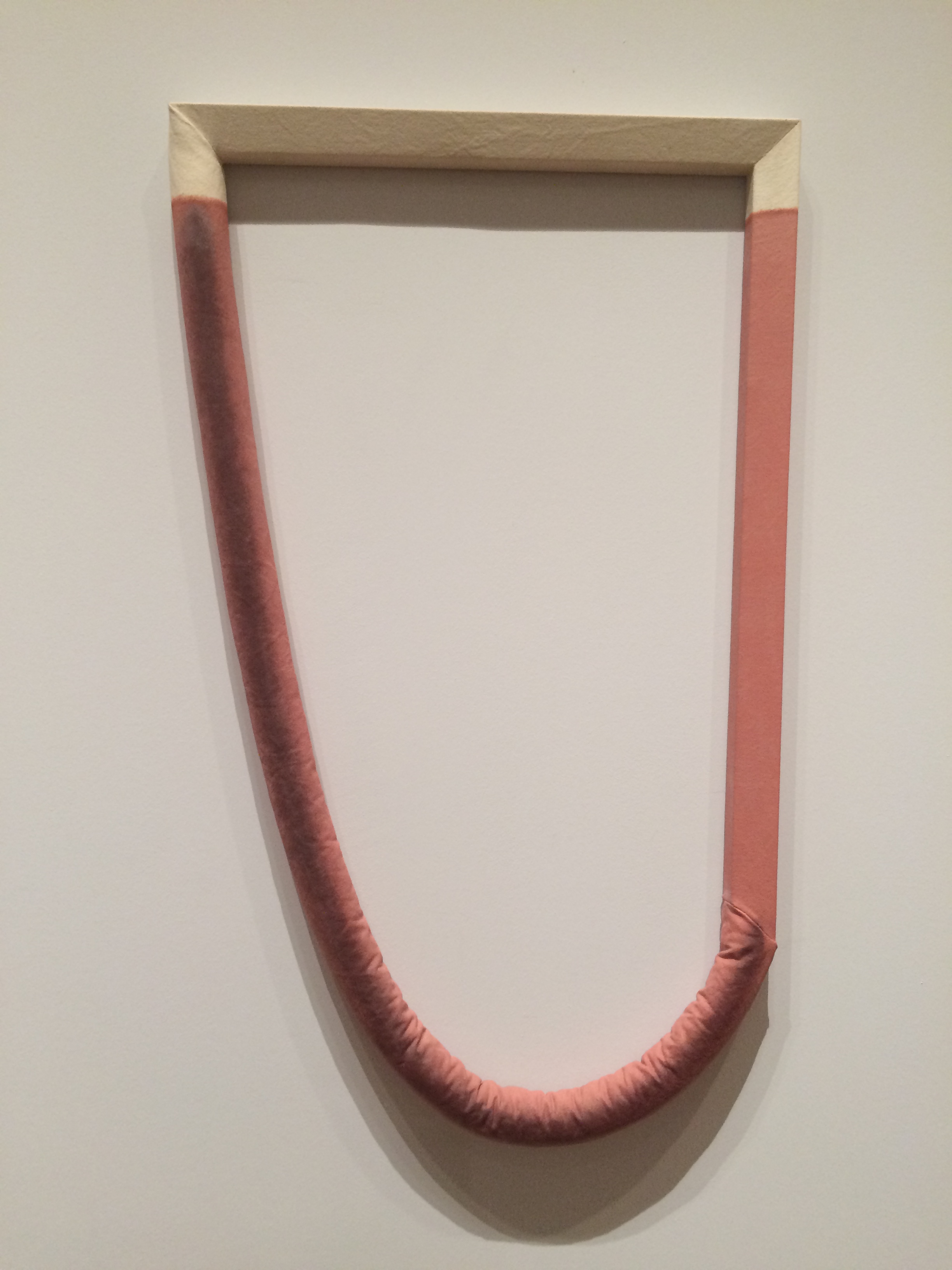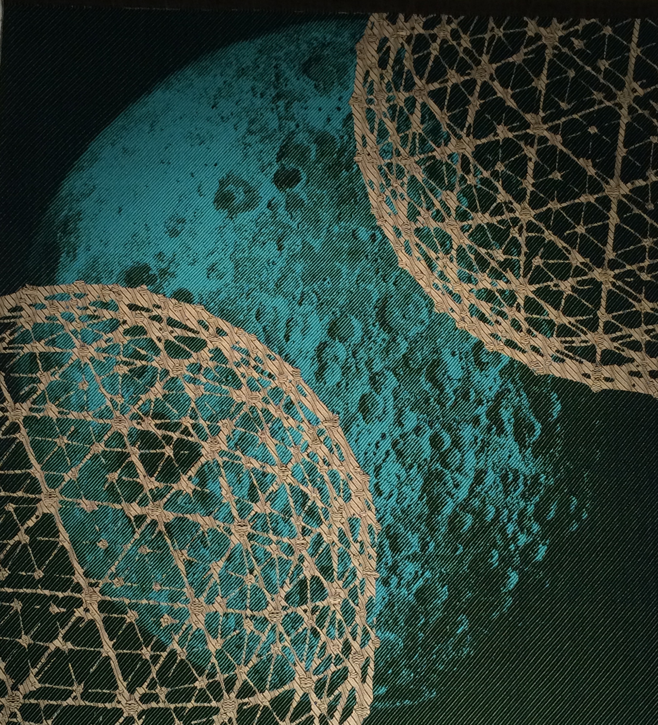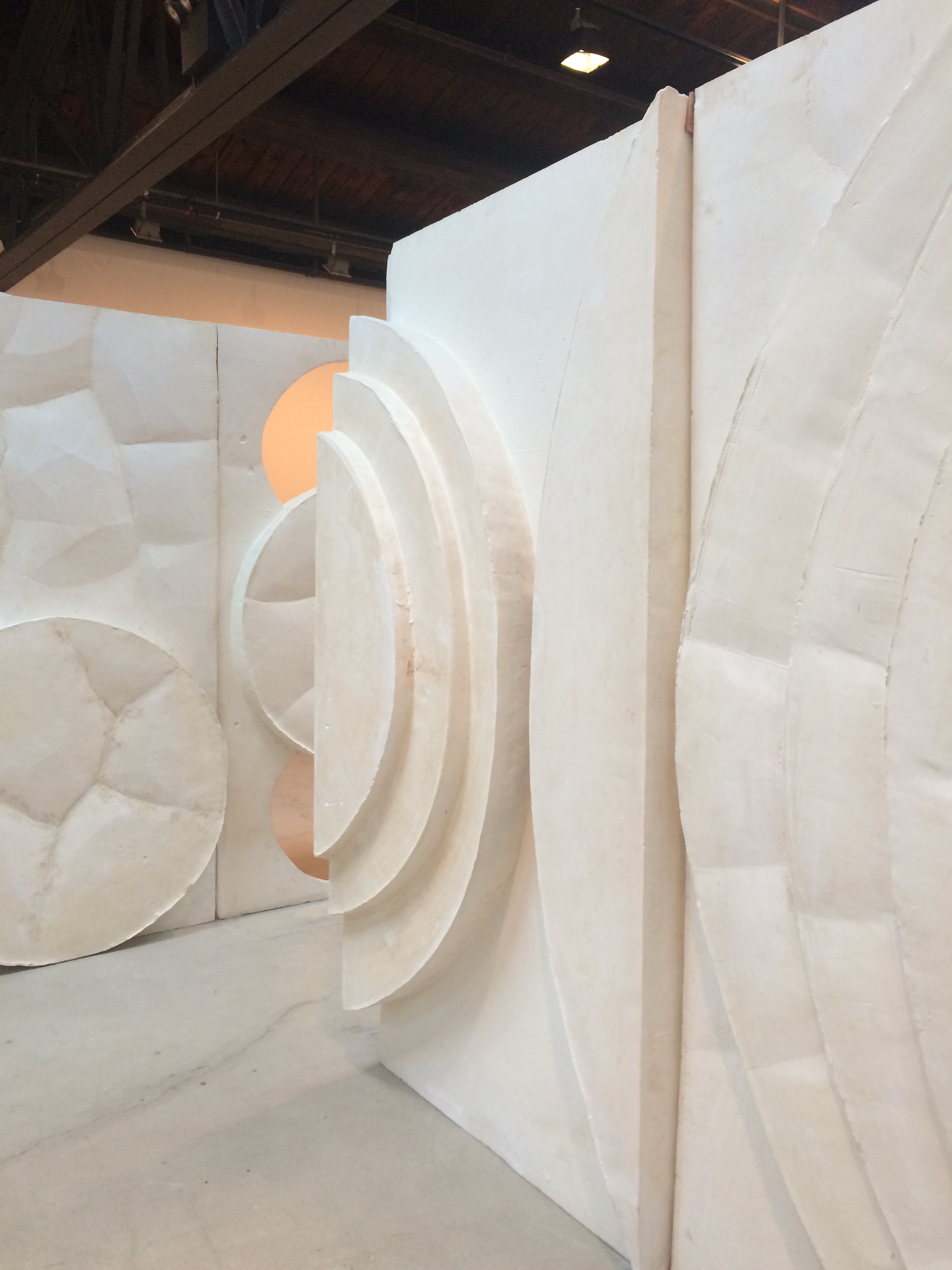 Annette Cords’ handwoven jacquard tapestry “Combined Operations” from 2012 was on display at the Umbrella Arts booth. I was immediately drawn into their space when I saw the geodesic spheres woven into this work. Cords also creates paintings and installations all dealing with systems of information and physics. The geometry of the spheres are quite clear but the jacquard weaving technique gives the lines a nice sketch quality. The lunar background gives the work an ethereal presence.