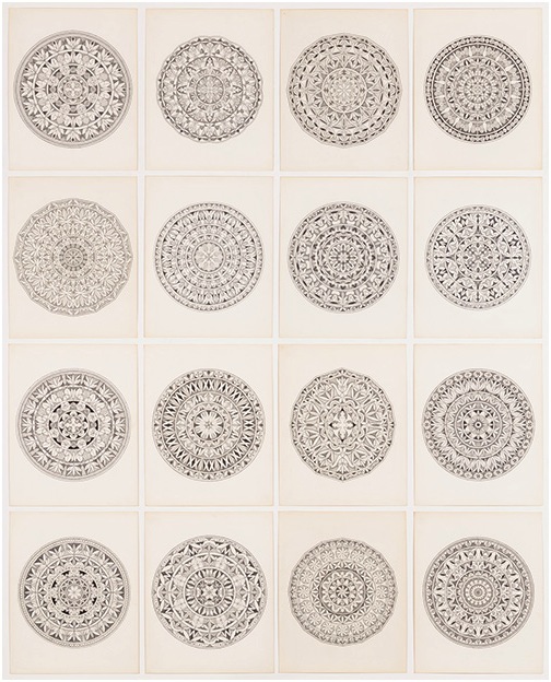 In the Ricco Maresca Gallery booth I found this amazing grid of drawings made in the 1940’s by Constantine Karron. These intricate works were all handmade using basic drafting tools. All but one of the 16 drawings are circles or regular polygons. The elaborate decorations feature rotational symmetries of varying degrees up to 16-fold. The precision and detail in these drawings is amazing. The only work that does not feature a circle or a regular polygon and has only 2-fold rotational symmetry is the drawing in the third column from the left, and is the third down from the top of the grid. This is a drawing of an irregular 16-sided polygon (hexadecagon) that has both horizontal and vertical lines of reflection symmetry. Ricco Maresca Gallery is displaying and selling these works as a group. Although each of the drawings is very interesting on its own, together they have an even more powerful visual impact.