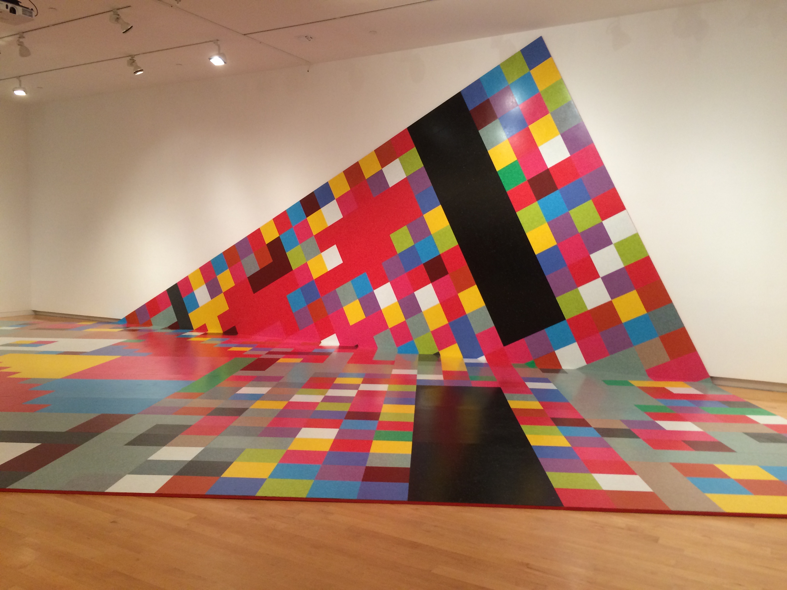 “Imperial Texture” consists of a grid of 1 by 1 foot square linoleum tiles that have been installed into the gallery at an angle so that they come off the floor and climb the walls. The tiling pattern was developed using computer software to make a digital model. This fact alone would make this a mathematically interesting piece. But what I find mathematically inspirational about this environment is the impact of a 2-D grid being retrofit into the 3-D rectangular box. The traditional gallery space has a multicolored seemingly random patterned floor, that has been shifted leaving part of the floor uncovered. Scanavino’s decision to place the grid at an angle has created series of right triangles with their hypotenuses running along the lines where the walls meet the floors. “Imperial Texture” gives the museum visitor an altered sense of space. The linoleum floor we are accustomed to seeing on the floors of schools, stores and other industrial and institutional settings has shifted out of it’s practical floor covering purpose.