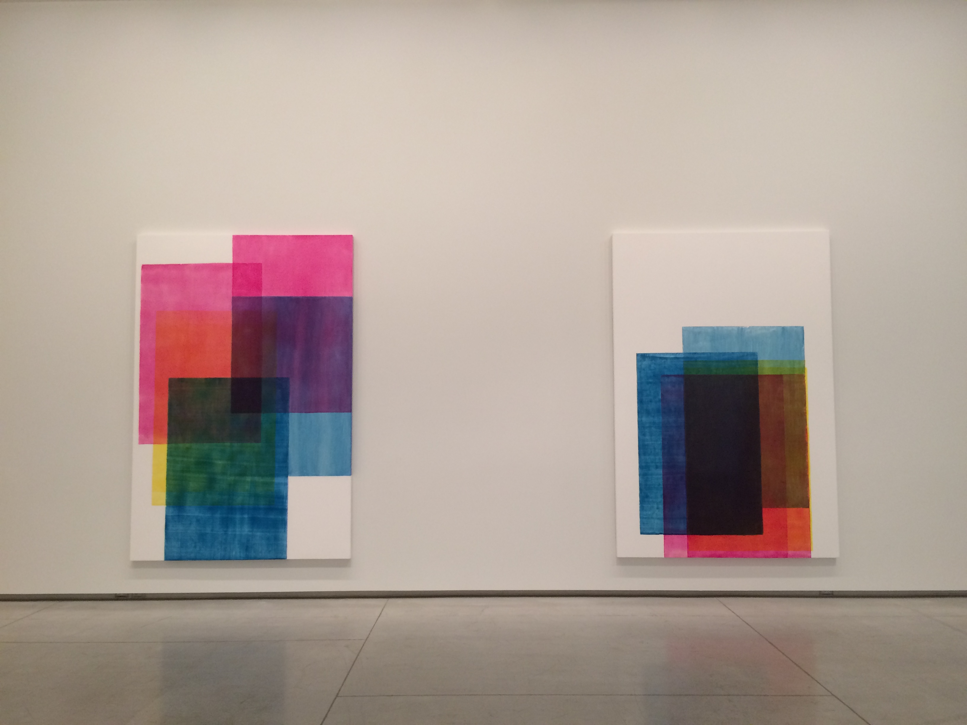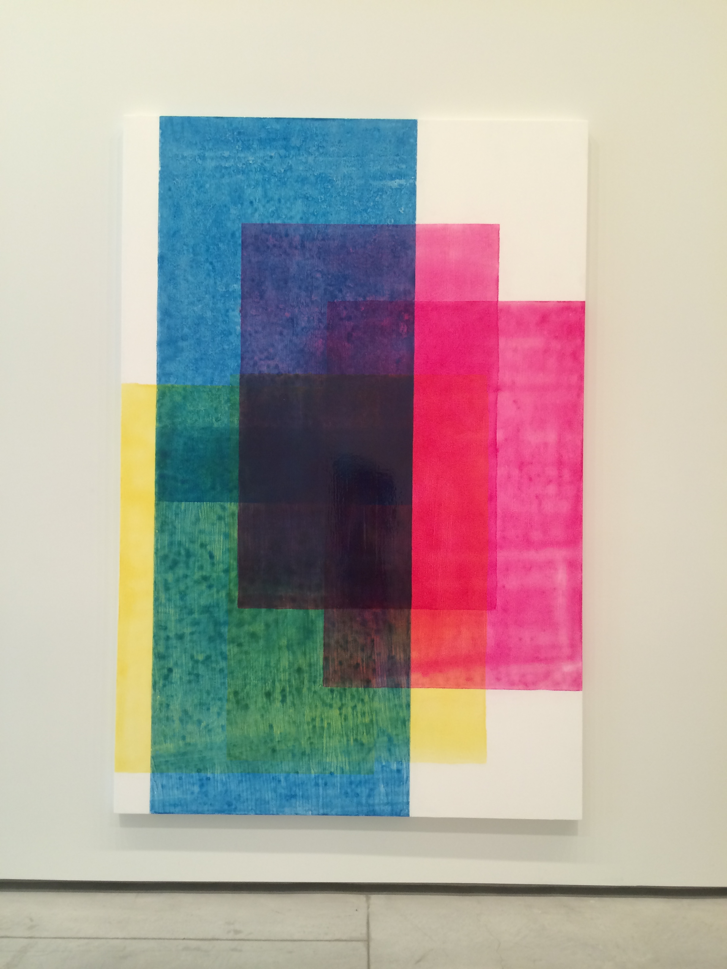 Each work in the series consists of a white canvas with six rectangles that are identical except for color. Two of the rectangles are red two, are blue, and two are yellow. Each of the primary colors has equal representation. The oil paint has been applied using mylar sheets to ensure the integrity of the rectangles. It is the placement of the rectangles that changes with each painting. There are an infinite amount of possible outcomes. Andrews is interested in the accumulation of colors that eventually make black. The areas where all three colors overlap become black rectangles. These black rectangles appear in different locations on each canvas. At first these painting look random but upon closer inspection you realize they all share the same geometric elements, there is consistency in the chaos.