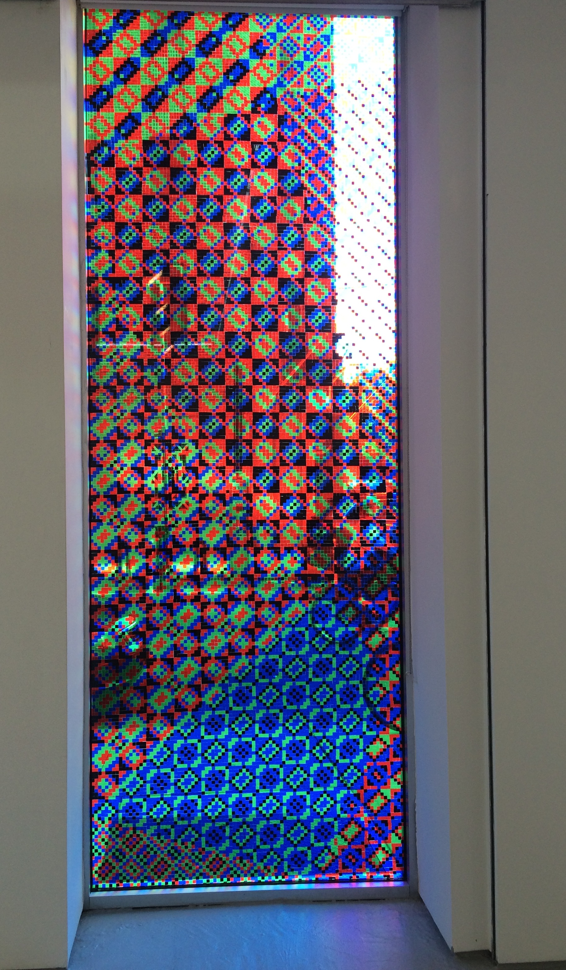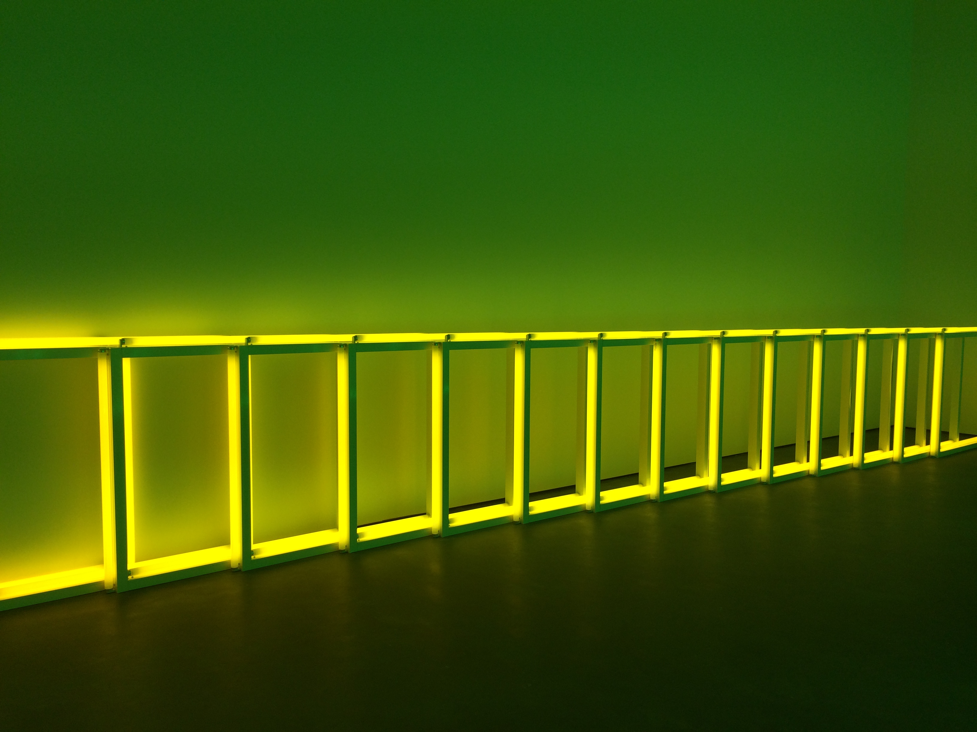Situated in the corner of the room “Untitled (to a man, George McGovern) 2” from 1972 is made up of a series of columns of circles of light. They descend in order from a height of ten circles to a single circle. The juxtaposition of the curves of the circles with the straight edges of the corner space and the placement of the circles with in a grid creates an interesting tension. The 45 degree angle produced by the descending columns gives the illusion that the circles are rolling down the construction. Dan Flavin is known as a minimalist and this work uses only the most basic elements, circles within an environment of straight lines, but the impact is impressive.