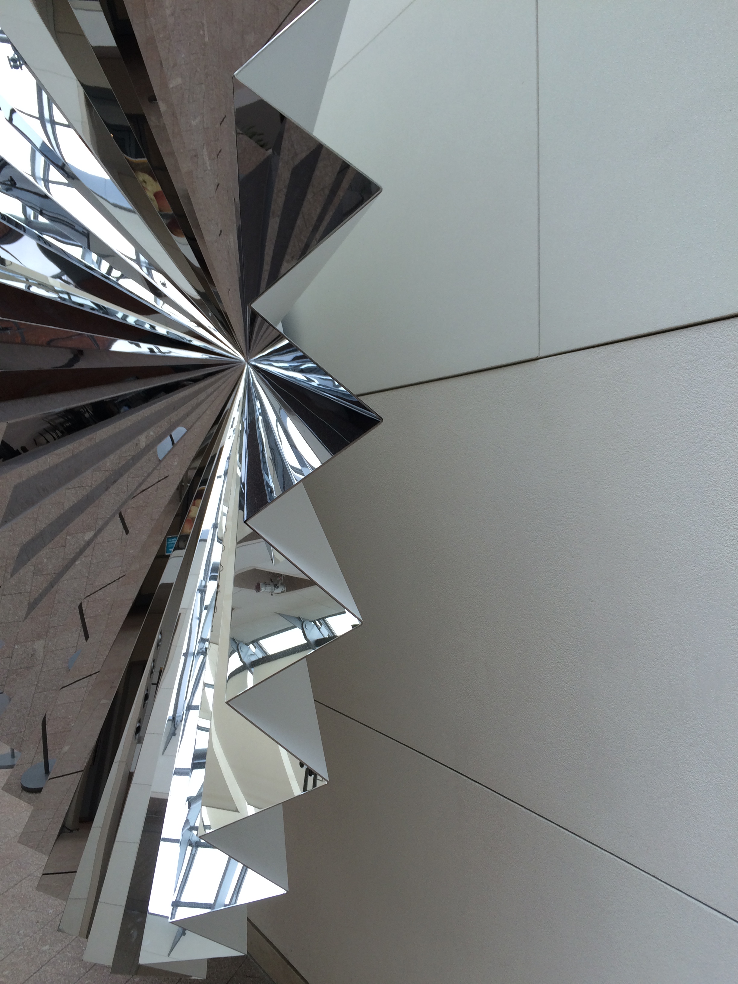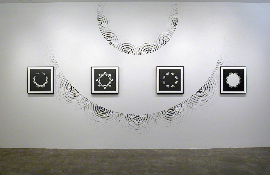 The wall drawing, in contrast, uses the gray scale to allow the large circles to fade away into the top of the wall. There is an allusion to the underlying symmetry of the forms, but it is incomplete. The lower of the two circles has the semi-circles forming on the exterior. The upper circle has the semi- circles going into the interior. This is a great demonstration of convex and concave curves. The marks of this drawing are the artist finger print, created by the artist pressing her charcoal covered finger directly on to the wall to create varying shades of grey. This tactile method creates an emotional connection to the viewer, adding another more human element to the exhibition.