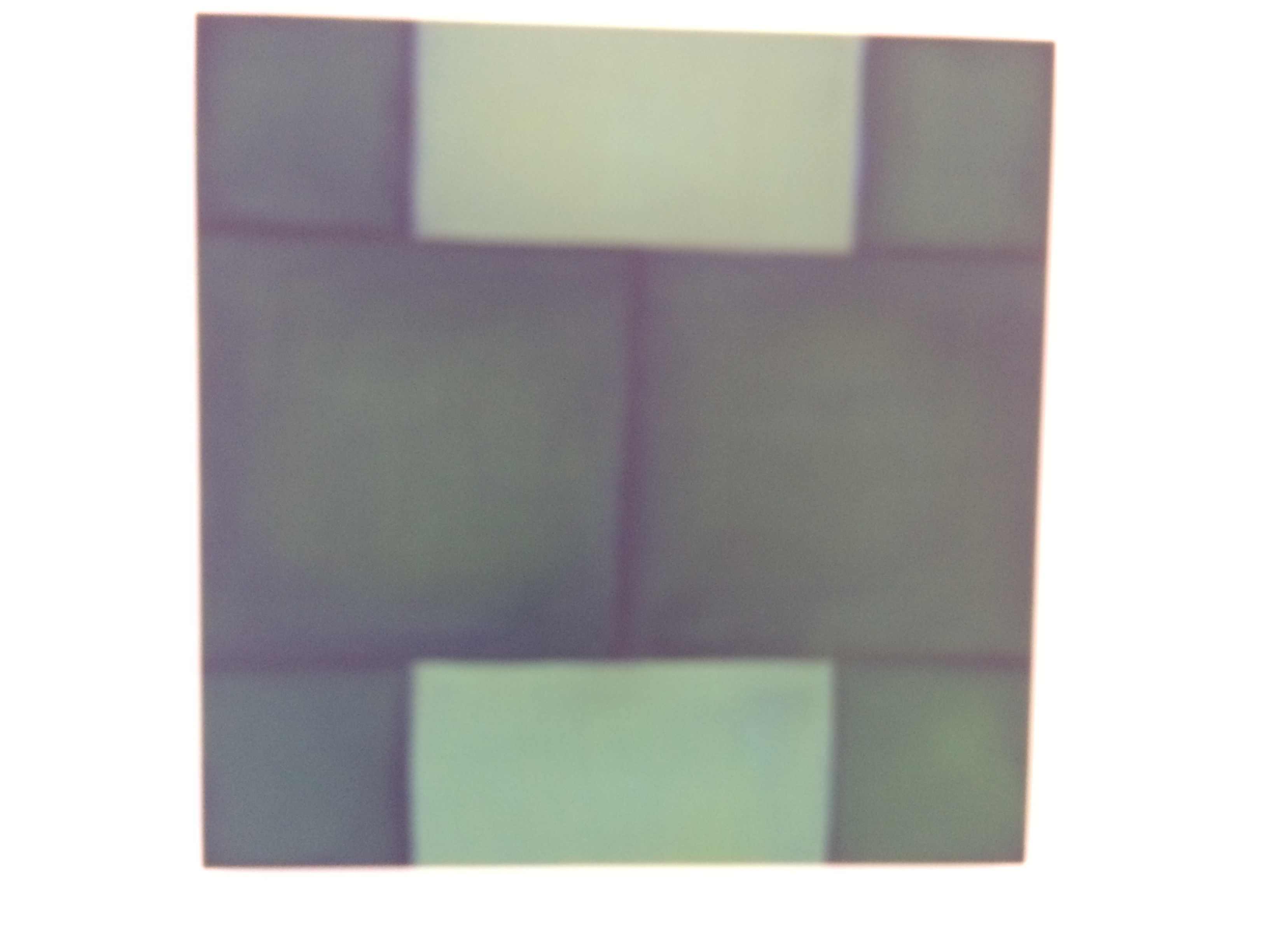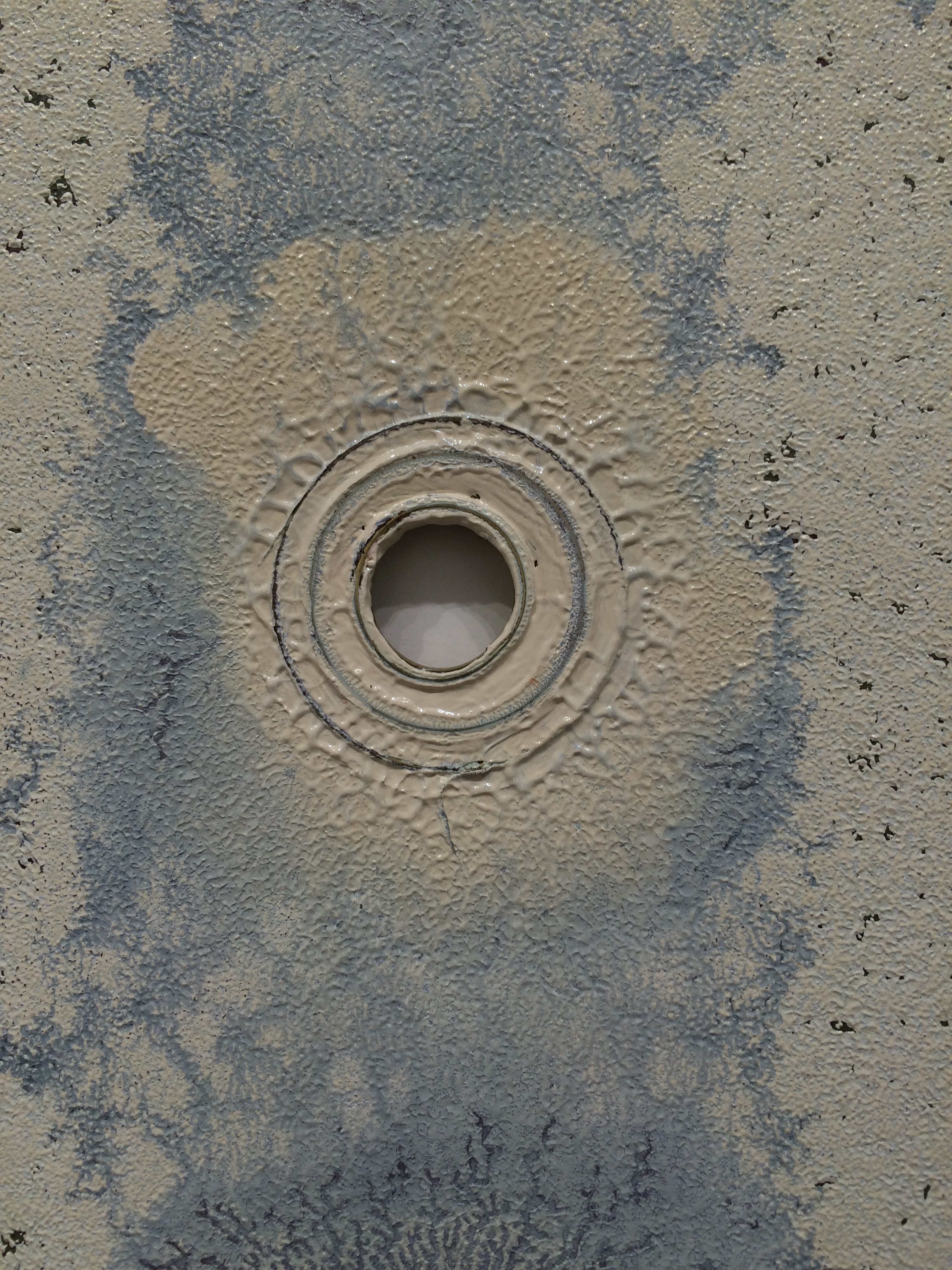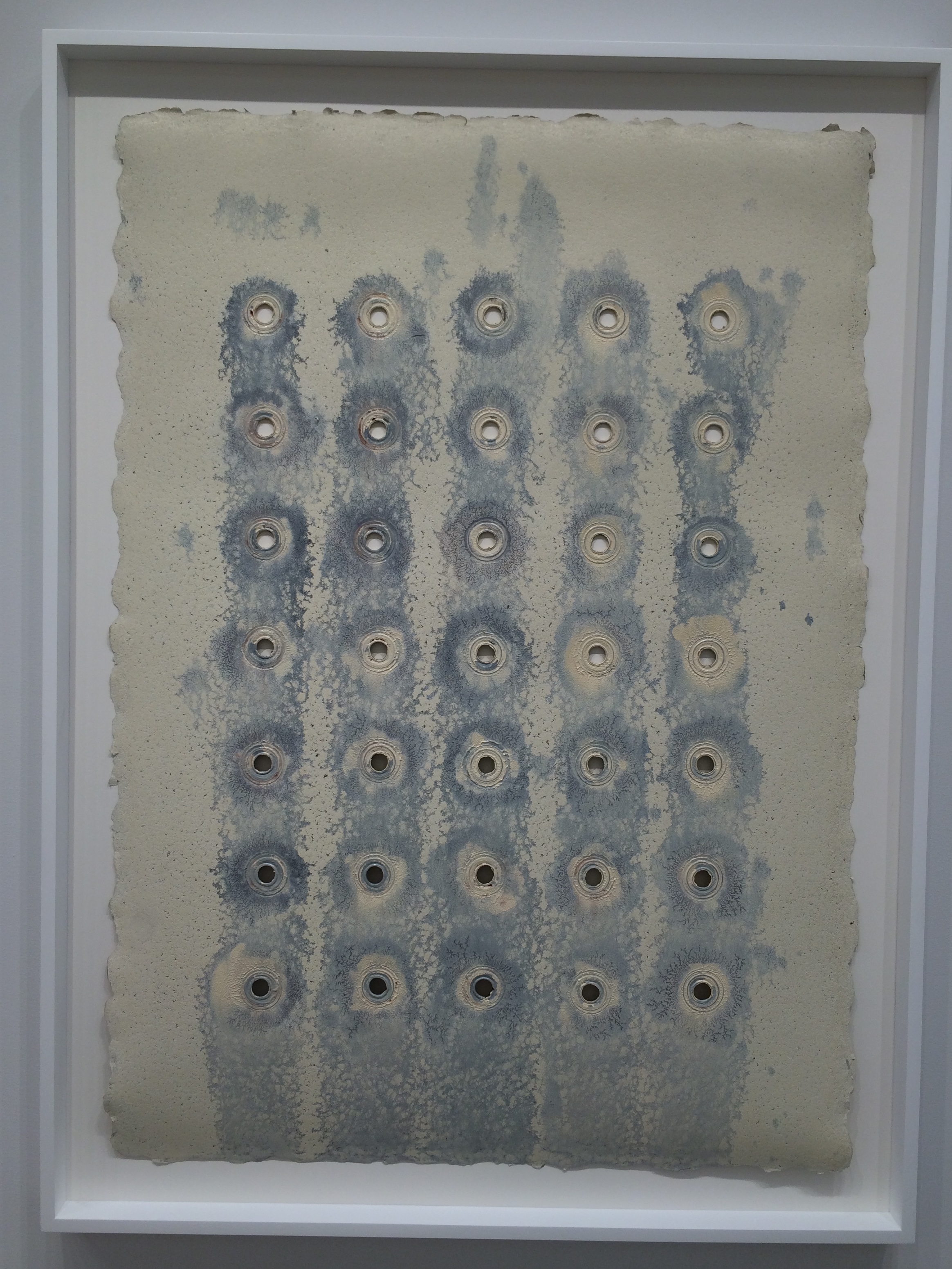 The monotype “White Rims #1” showcases the concentric circles created by the grommets. The organized 5 x 7 grid of holes juxtaposes the more random pigmentation of the print. The ink flows and pools and plumes around the structures. The edges of the paper have a rough, almost torn, quality that is in contrast to the gridded repetition of the circles. There is a push and pull of chaos versus order, geometry versus the physicality of Hammond”s artistic process.