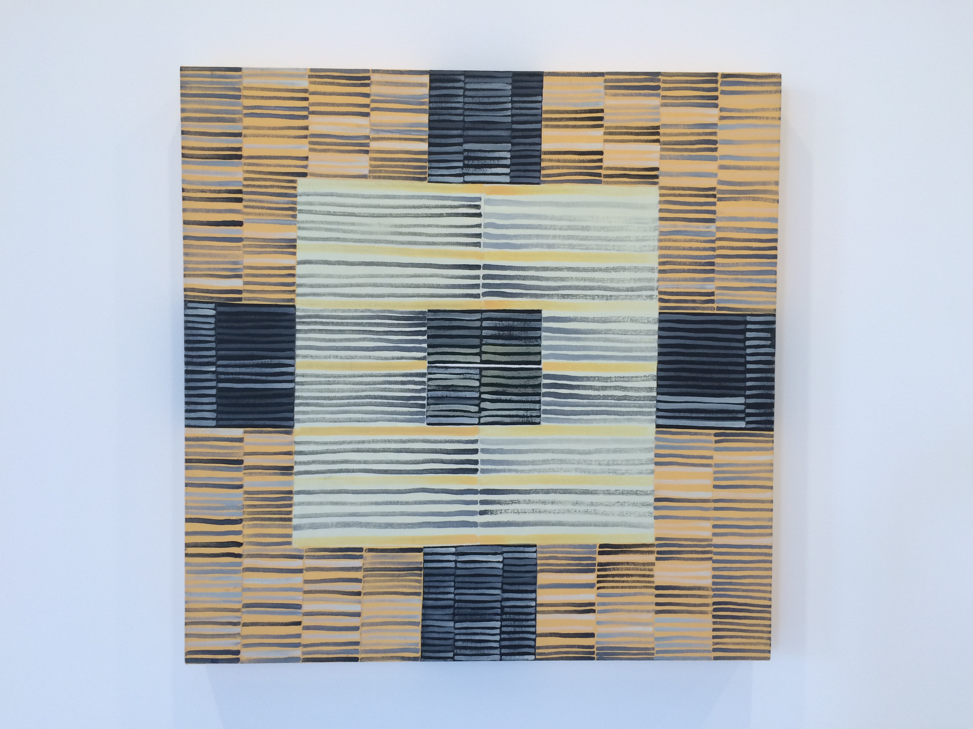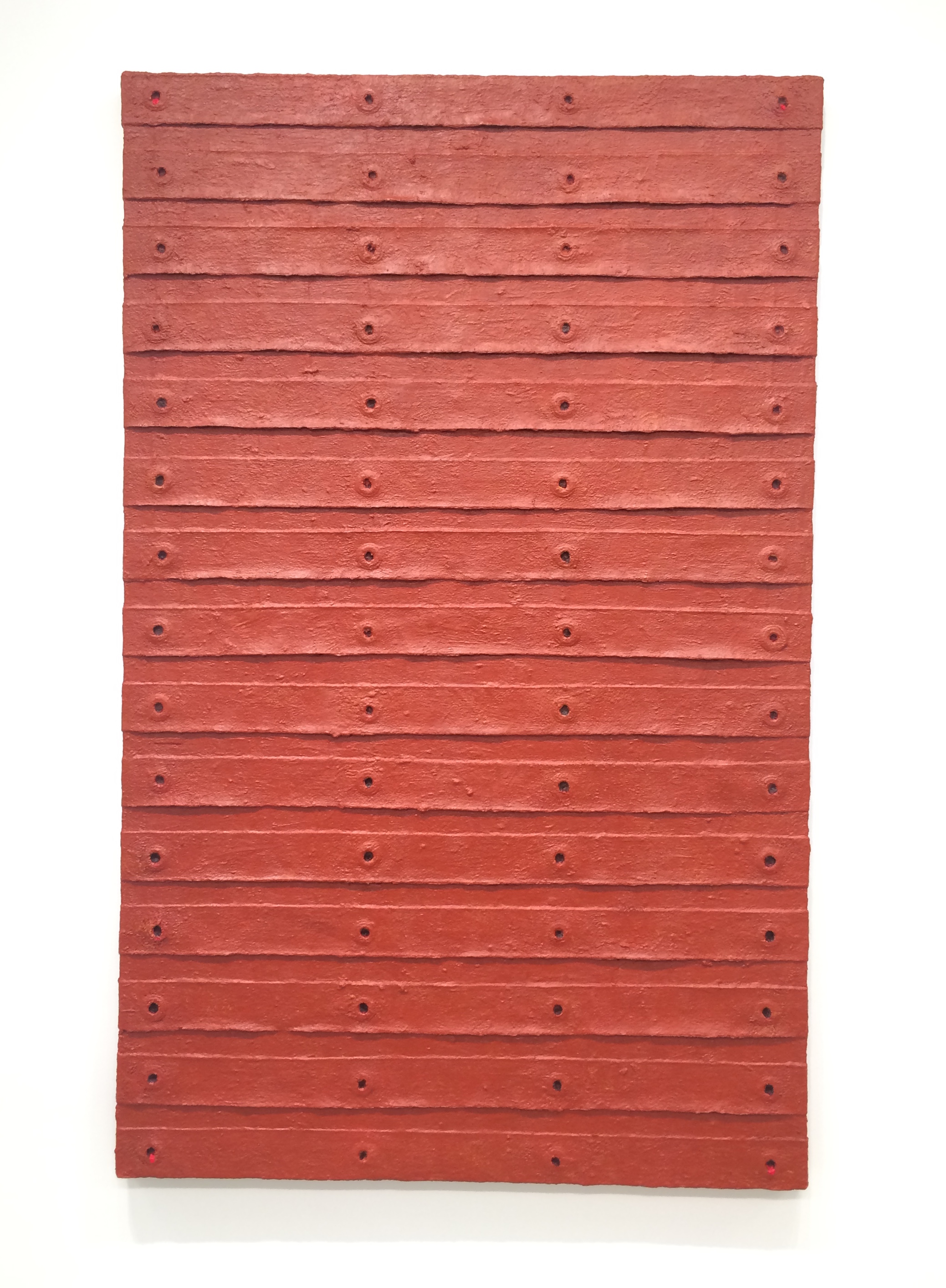 The painting “Red Stack” features a series of evenly placed horizontal straps, as well as a grid of metal grommets. The linearity of the rows of raised strips of fabric is interrupted by the circular grommets. This work has a very sculpture quality with a rough surface that keeps all of the lines and proportions from being hard edged and perfect.