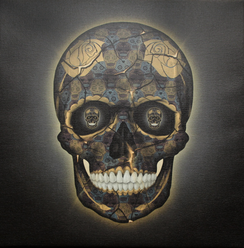 A tessellating skull pattern is wrapped around a human skull. The eyes of the skull are scaled down versions of the entire image. This is then repeated infinitely. As TA fans will know, M. C. Escher is widely recognised as the father of tessellation. Both the theme of infinity and the use of skulls were commonly featured in his artwork. The tessellating skulls are decorated as calaveras – also known as sugar skulls. These are used in the Mexican celebration of the Day of the Dead (Día de los Muertos). Each of the three main skulls in the triptych have a unique decoration and color scheme.