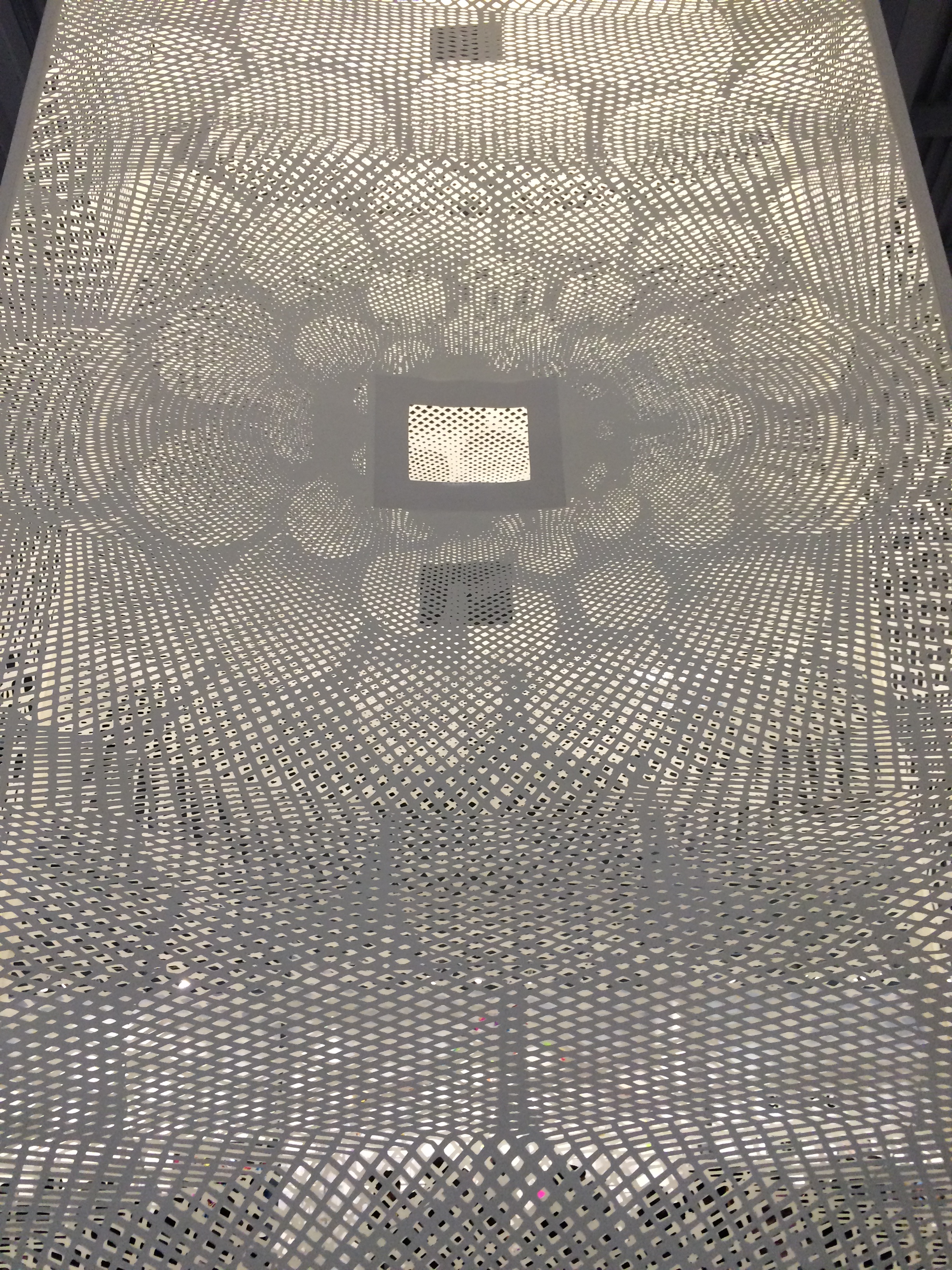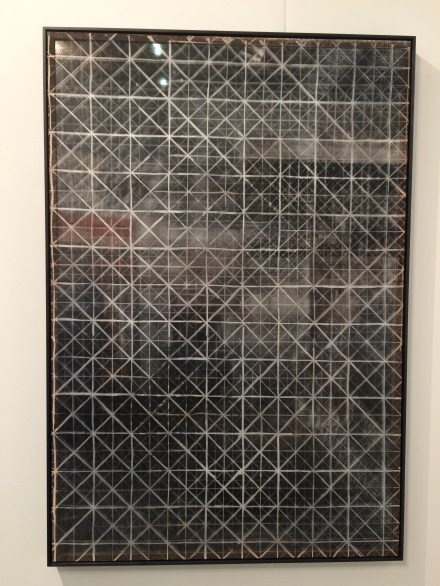 This next work, by Shannon Bool, is a large- scale oil and batik on silk. The fabric is slightly transparent and backed with a mirror which creates an interesting repetition of the design, as well as a slight ghost of the reflection of the viewer. Through the use of grids and diagonals, there is a reference to the geometry of architecture.