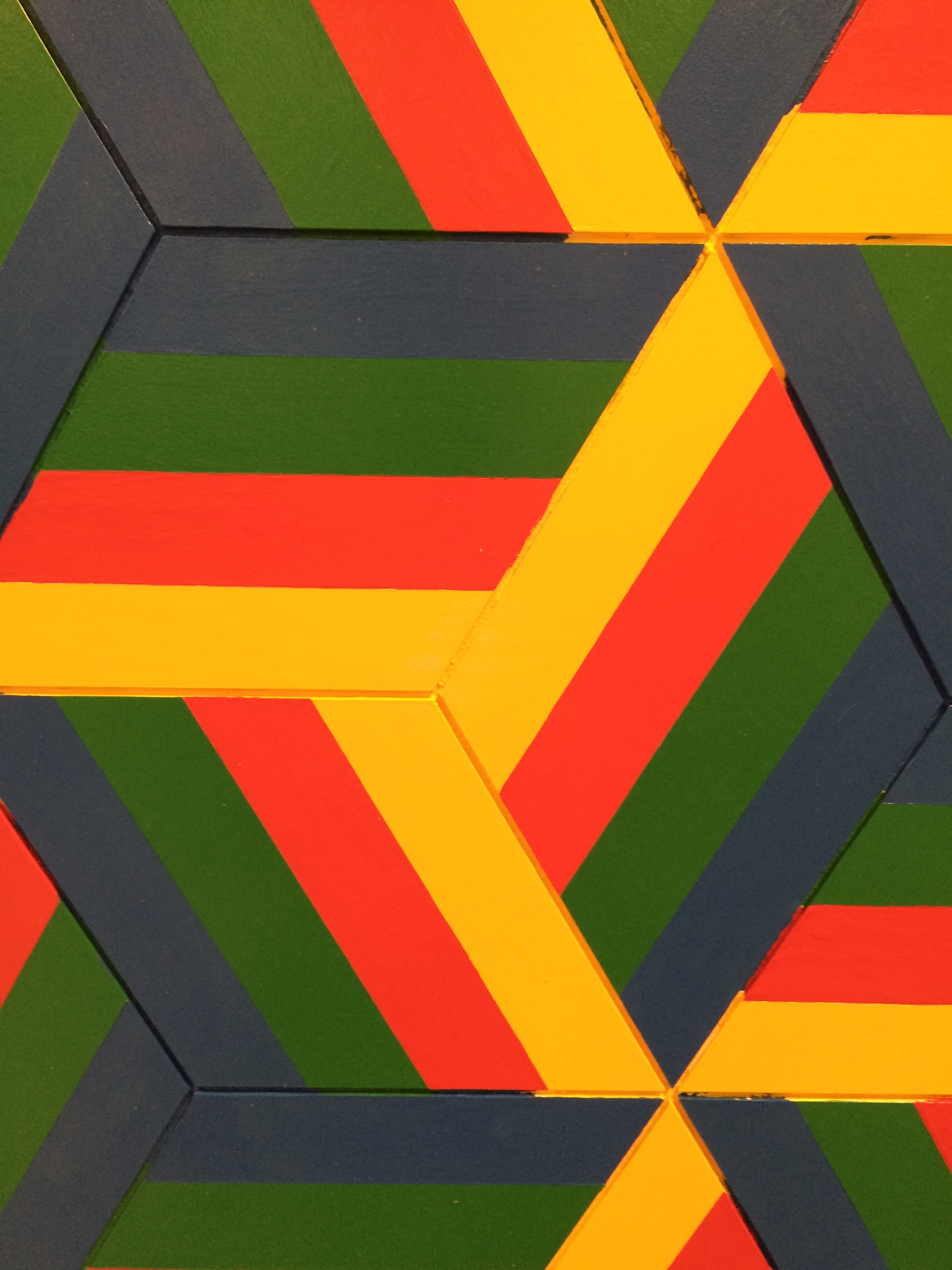 Jim Iserman’s acrylic painting is a pulsating homage to hexagons. This work is made like a tiling. Each hexagon is created using three rhombi. By situating the yellow bands to meet at the center, Iserman creates a Y-pattern. The forms take on the presence of cubes jumping off the surface.