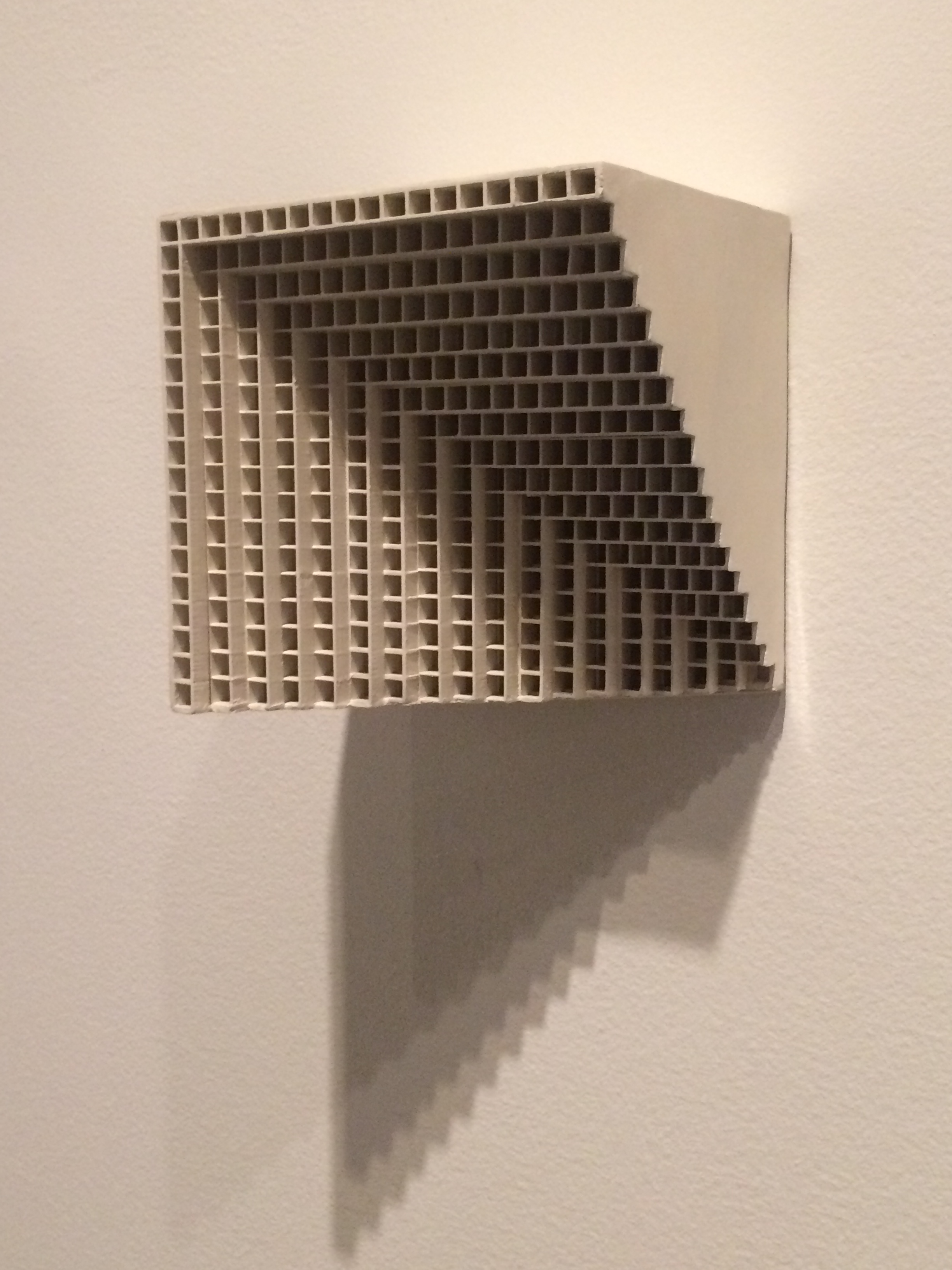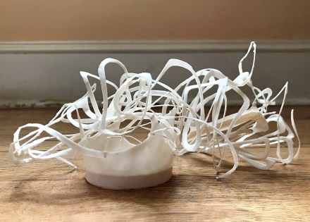Another body of work was the project transforming discarded paper coffee cups into space filling sculptural objects. She set herself the challenge of making the cup occupy as much volumes as possible without either adding or removing materials. Many of the artist’s solution approach surface filling curves before being expanded into a elaborate brambles resembling tumbleweeds or feathers. Starting with a familiar object on the brink of its own extinction, she expands it to occupy more time, in the form of her careful attention to it, and space.
