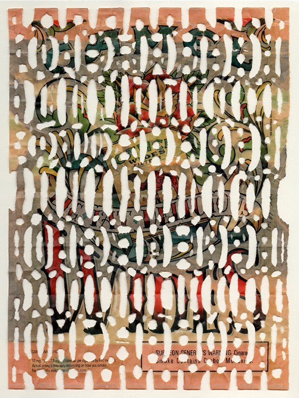 The touch of the hand is key to understanding the artwork. At first glance Nicotine appears to be a perforated and colorful lattice. Closer examination reveals the nearly disposable substrate and the patience evident in the handwork. The careful attention and repeated touching of the material elevates the sheet of paper out of the realm of rubbish into the realm of a carefully realized work of art. In this sense Ms. Mantell’s work is transformative, use mundane materials to reflect on the nature of transience.