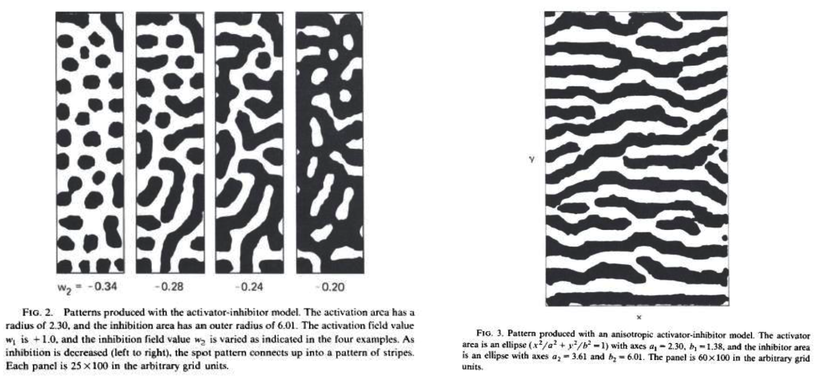 Turing Patterns taken from David A. Young’s Article, A local Activator-Inhibitor Model of Vertebrate Skin Patterns, Mathematical Biosciences, Volume 72 issue 1, November 1984, page 51.
