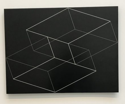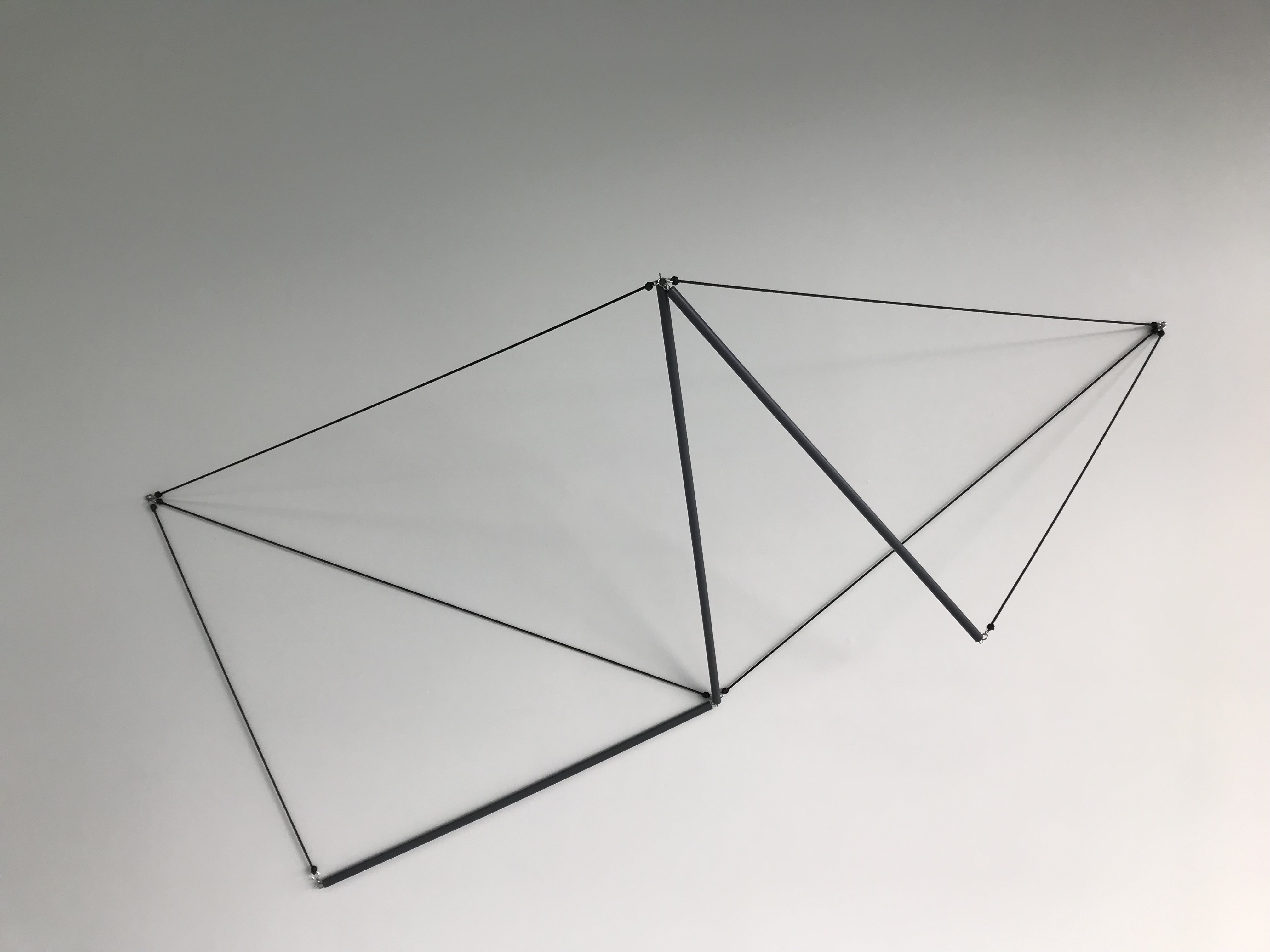 Daniel G Hill’s wire frame wall drawing “Dishtowel Fold” from 2018 is a construction using straight lines to present the basic outline and folds of a form effected by gravity. The two ends are isosceles right triangles. The left hand triangle flush against the wall and the right hand triangle falling forward off the plane.