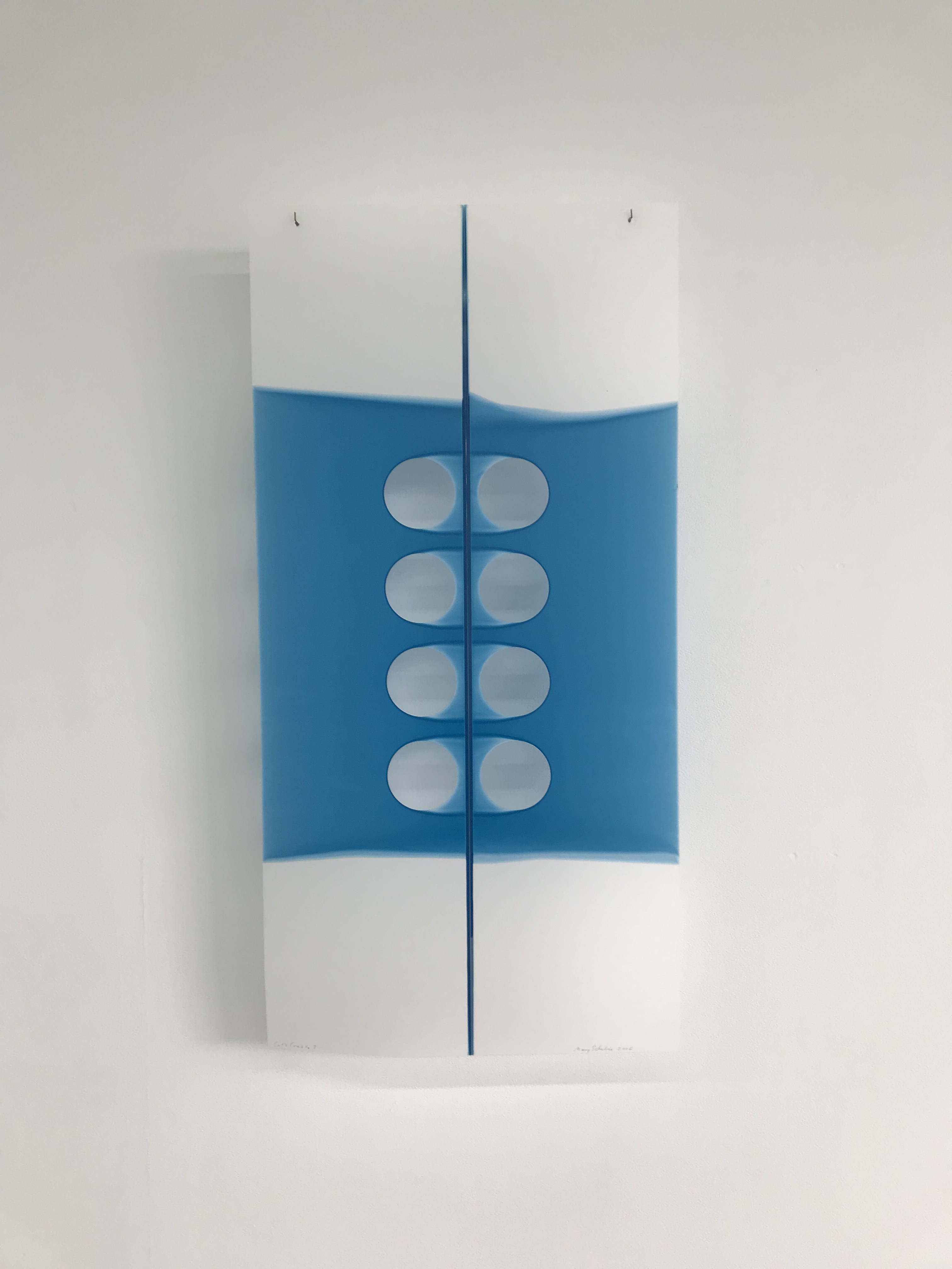 Mary Schiliro’s acrylic painting on Mylar “Cat’s Cradle 7” from 2006 incorporates two columns of circular cutouts. The vertical line of reflection symmetry resulting from the cutouts is subverted by the fluid veil of blue transparent paint.