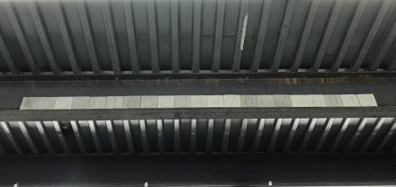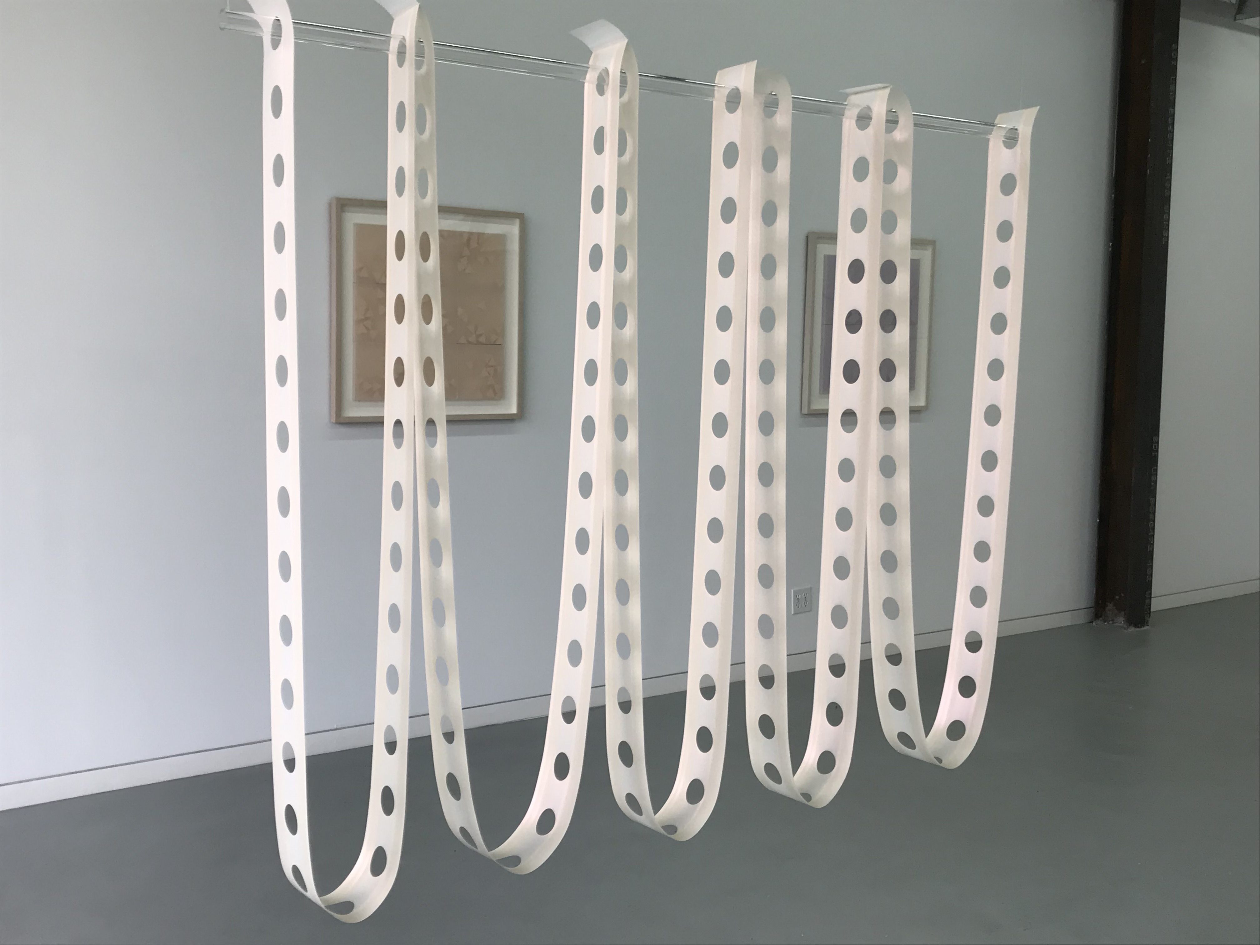 Schiliro’s installment “Disembody” from 2017 continues the theme of a straight line of circular cutouts. The long Mylar ribbon is presented in loops hung from a plexiglass rod running through the center of the gallery. The forces of gravity creating the undulating curtain. The cutaways lined up to create a series of voids illustrating the concept of positive and negative space.