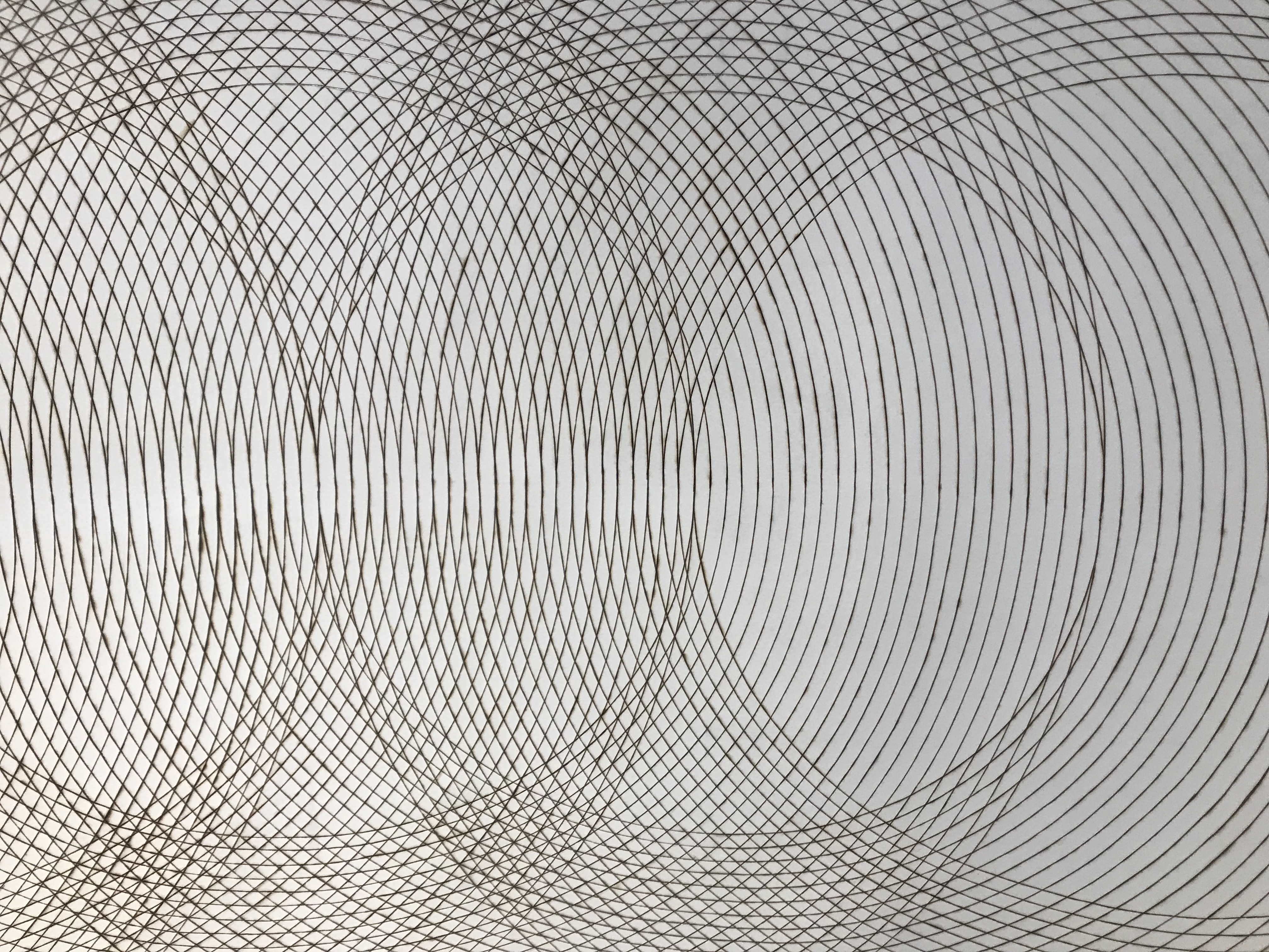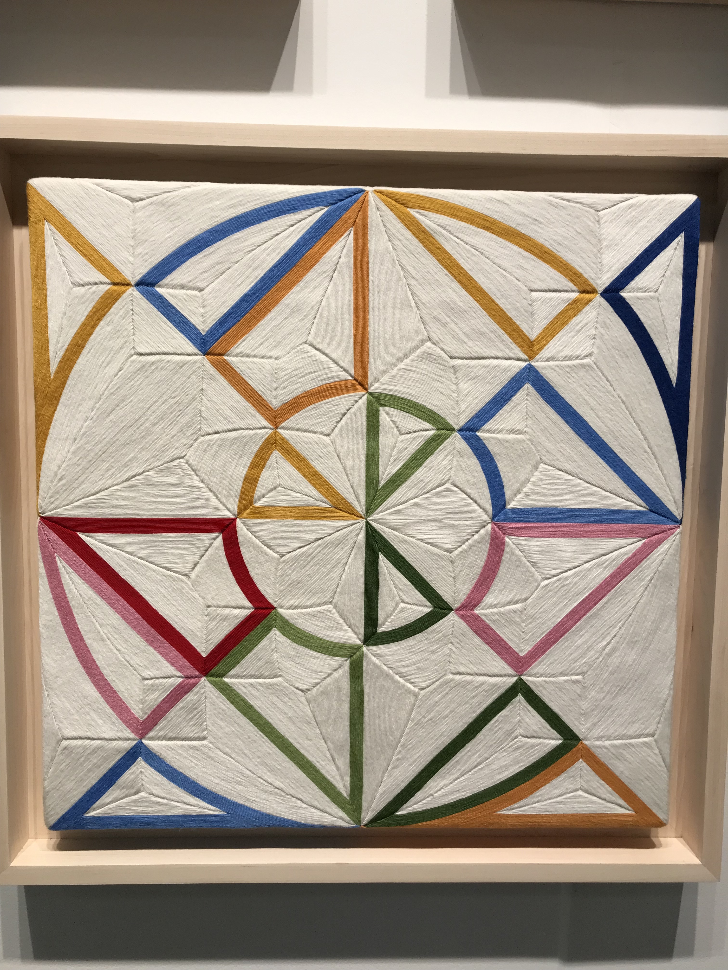 Eduardo Terrazas creates geometric forms using wool yarn on wood boards for the series “ Possibilities of a Structure” from 2018. Each of these works have an underlying stitch pattern featuring order 4 rotational symmetry and a circle inscribed within the square structure of the board. The symmetry is broken by highlighting some of the geometric forms with colored thread. Each shape possesses one curvilinear side. The concept of a non symmetrical pattern with a symmetrical framework offers a refreshing way to look at geometry.