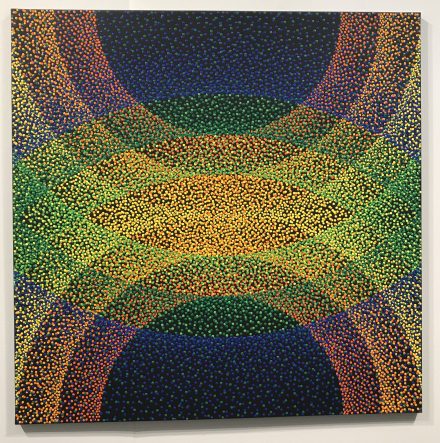In the Galeria Nara Roesler booth, Julio L Parc’s painting “Alchimie 420” from 2018 was on display. This work offers a pointillistic representation of two half circles with concentric arcs radiating out from the top and bottom of the canvas. As the arcs get larger they overlap at the center and fall of the picture plan on either side.