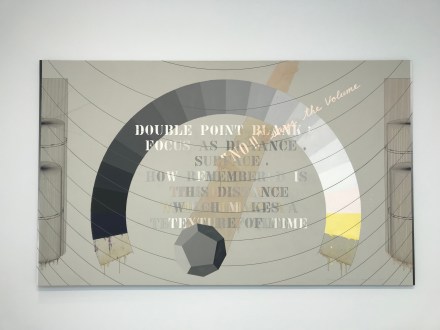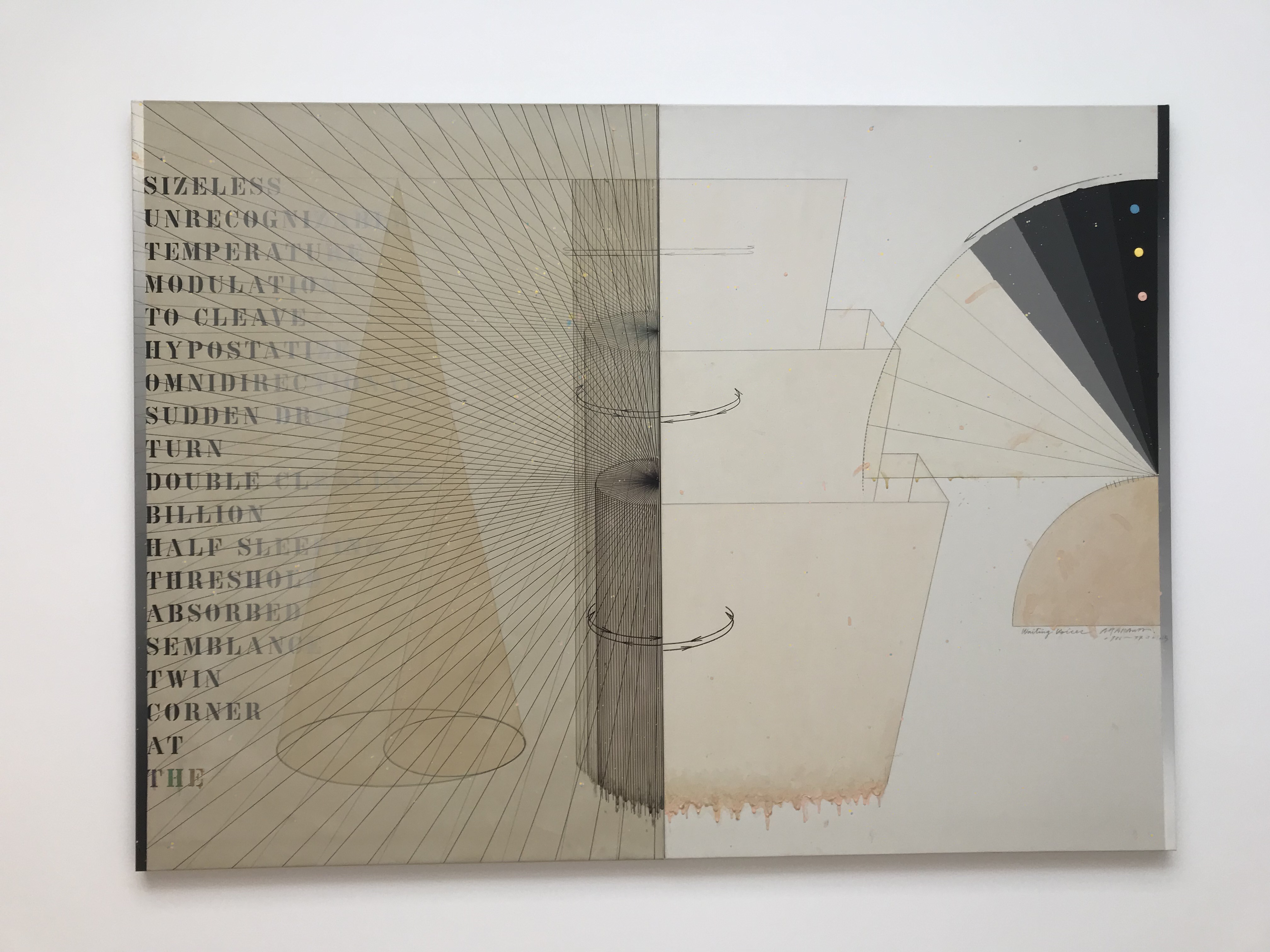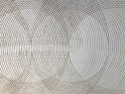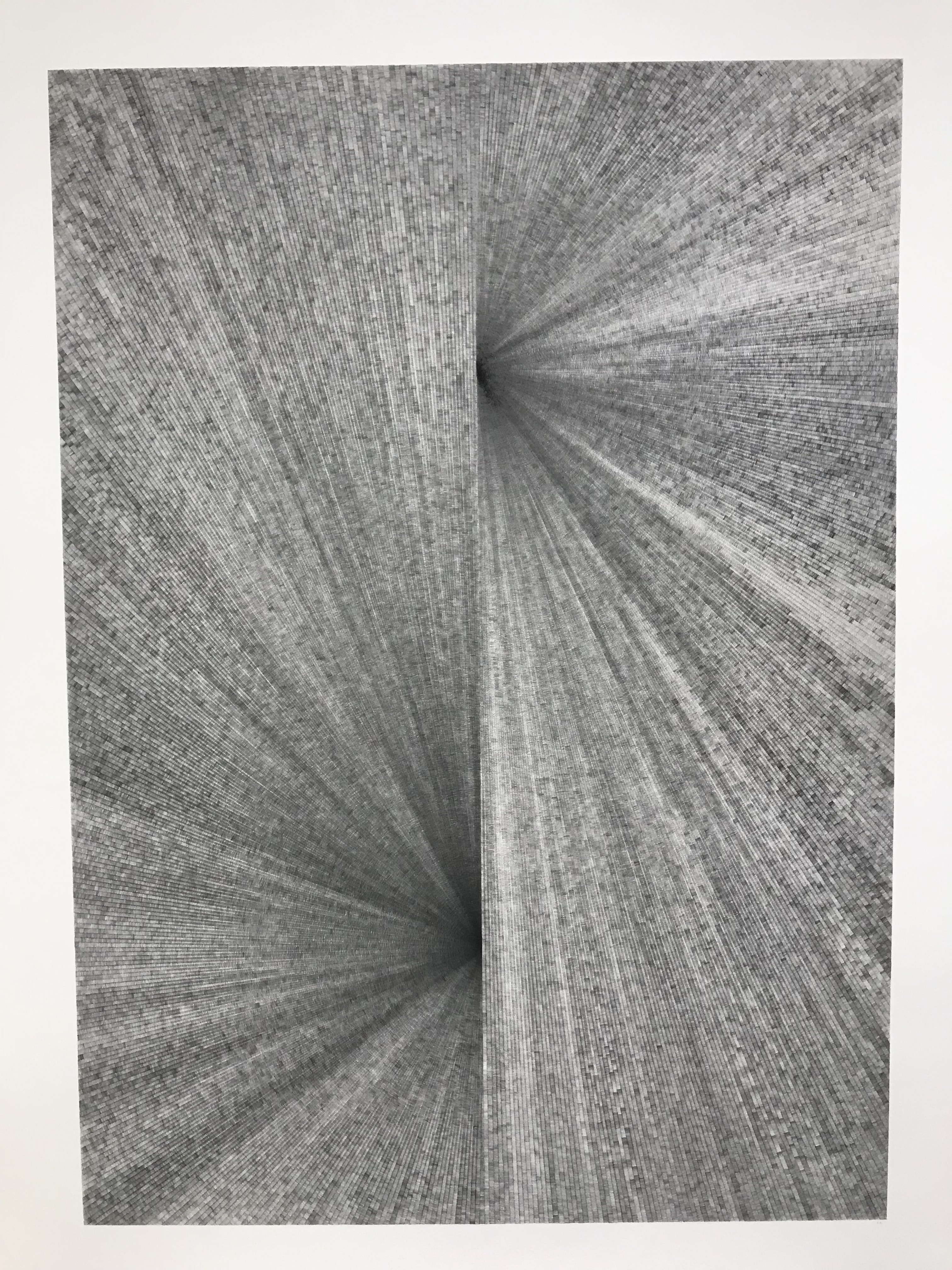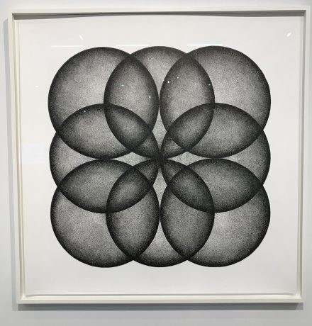 The i8 gallery from Reykjavik Iceland presented Ignacio Uriarte’s 2018 ink on paper “ Eight Circles Form a Square”. Uriarte’s circles feature a textural shading technique that give them a 3 dimensional presence, but at the same time they appear somewhat transparent because you can see all parts of all 8 circles even they are over lapping. The square structure is formed by two columns of three over lapping circles and over that there is a central column of two non-overlapping circles. There are four sections where three circles and overlap.