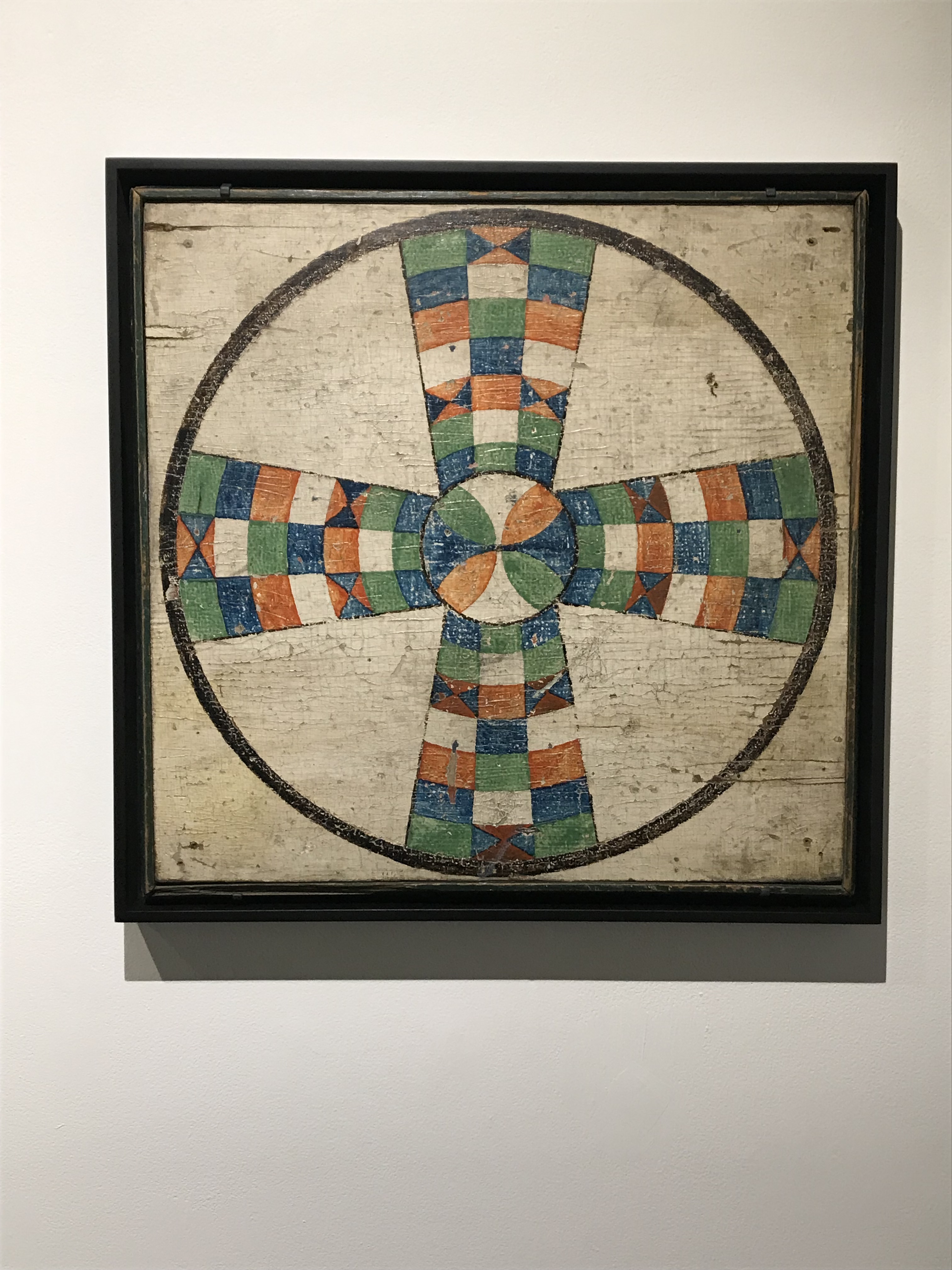 The exhibition “Playing Games: Chance, Skill, and Abstraction” at the Ricco/Maresca gallery presents antique handmade game boards along with contemporary paintings that feature the similar mathematical imagery. Before parlor games were mass-produced artisans hand painted the geometric patterns onto wood boards.
