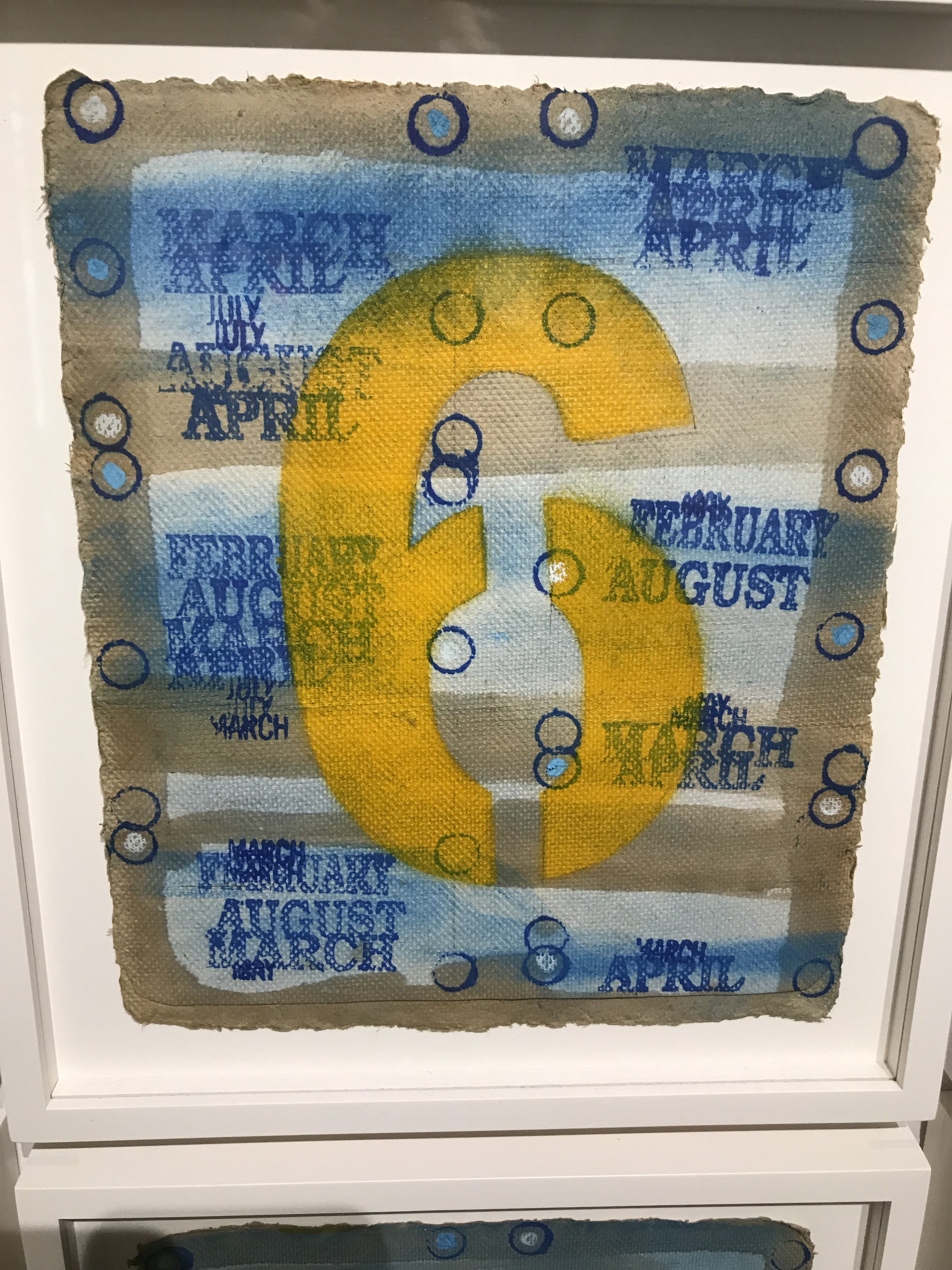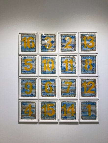 “Magic Squares” the mixed media work from 2016 is 16 framed rectangular sheets presented in a 4X4 arrangement. Each one features a number from 1 to 16. The magic is in the arrangement, the numbers in each row, column, and diagonal add up to 34!