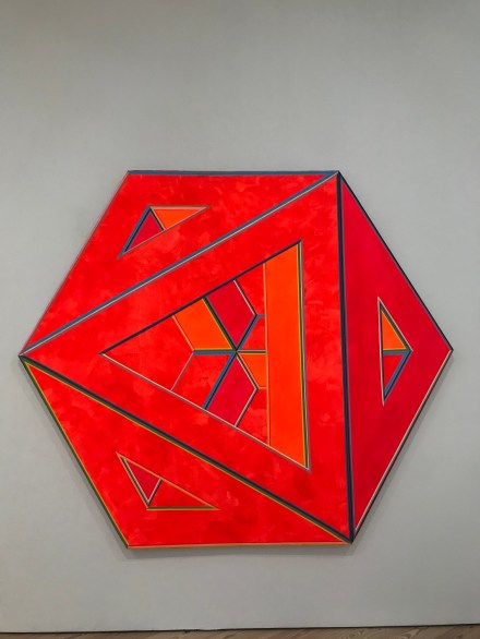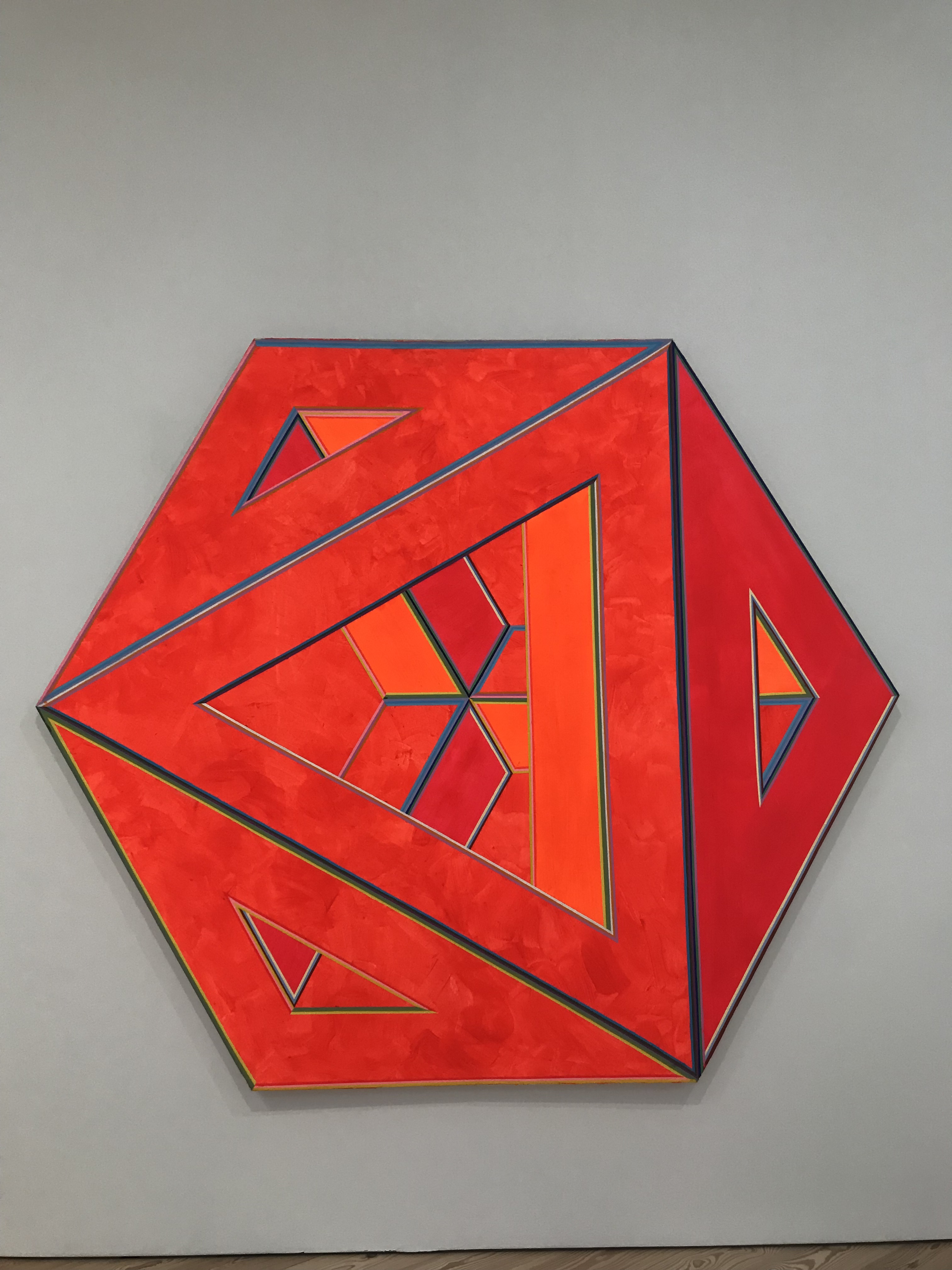 Alvin Loving’s  “Septehedron 34” acrylic on shaped canvas from 1970 presents a 3-D projection of an imaginary seven sided figure on to the 2-D plane. Made up of a lattice of seven right triangles , the viewer is looking directly at one triangular face, surrounded by three other triangles with the three remaining triangles intersecting in the background.