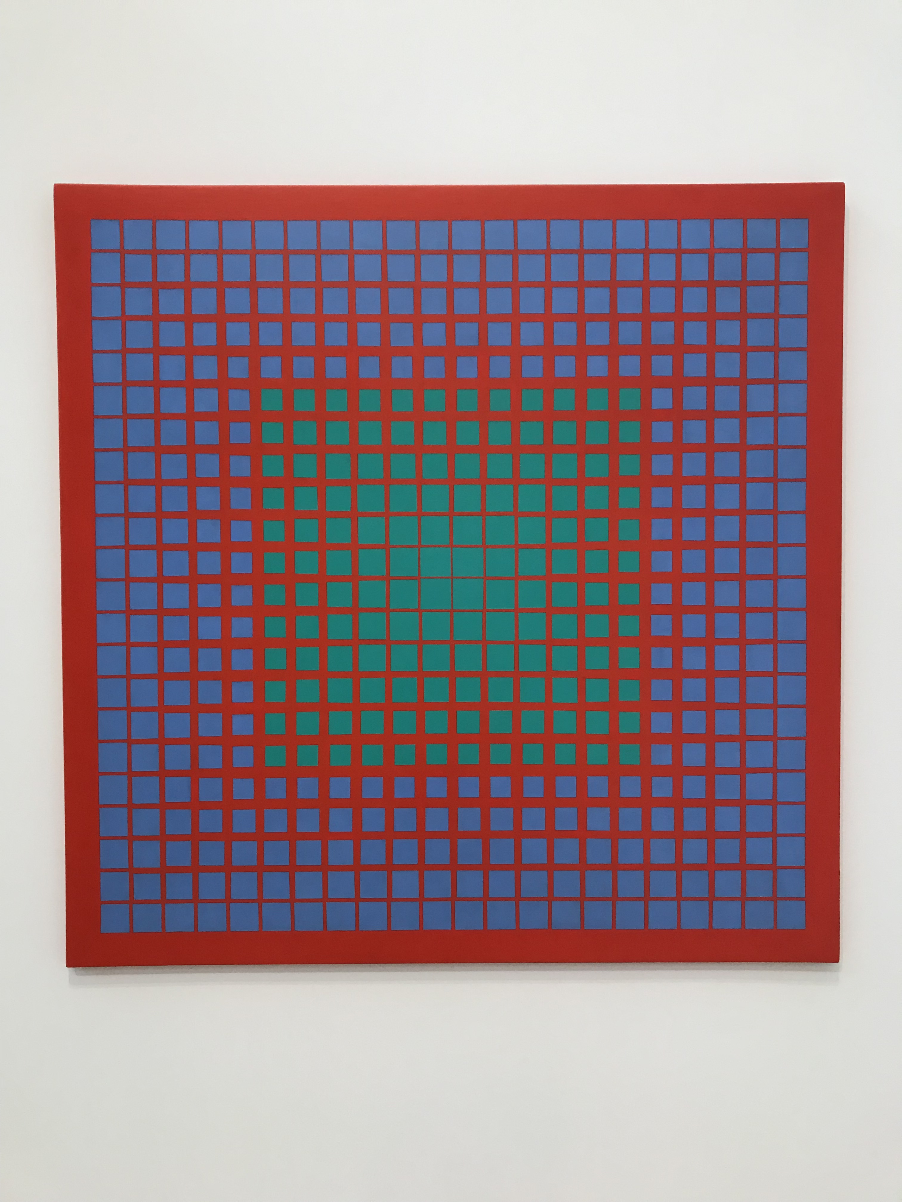 “The Fourth of the Three” from 1963 by Richard Anuszkiewicz has only three colors of paint but the image created appears to have a much more complex palate of various intensities. The undulating grid of not quite all squares was manipulated by varying width of the red lines between the shapes. Using a mathematical plan, the lines are thin at the four sides square panel, then growing thicker,  before getting thin again at the center. This creates the optical illusion of movement.