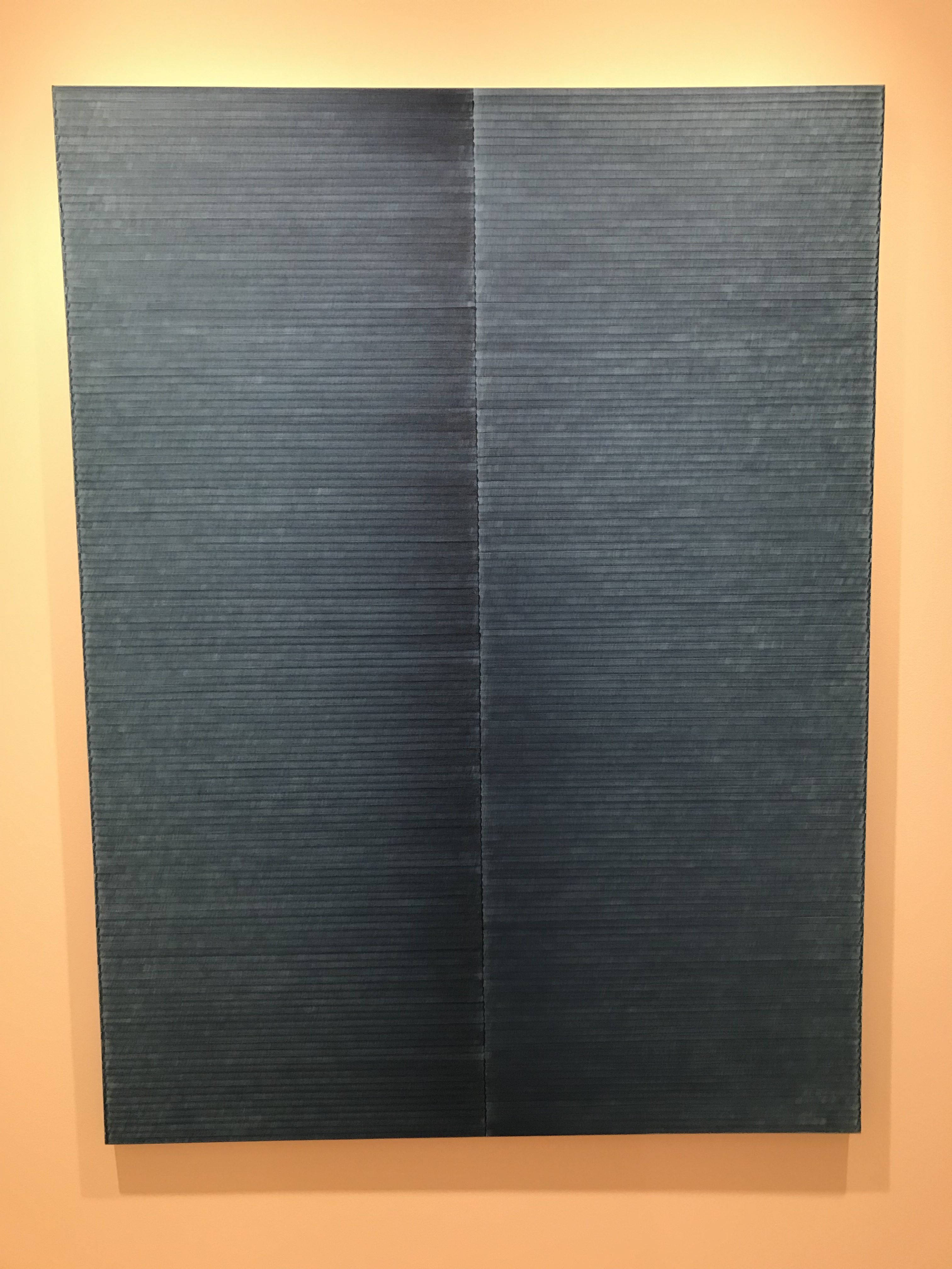 In “Radical Writings, poem for Gaston Bachelard”, oil on canvas from 1995 Blank illustrates the basic geometry of the traditional codex book form. There is a vertical central spine and the evenly spaced horizontal lines.