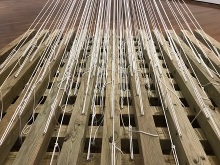 The artist’s text that gives the parameters for installation is posted on gallery wall: “One hundred nylon robes emanating from a single source in the ceiling, suspended from top to bottom, anchored in concentric circles with metal plates”