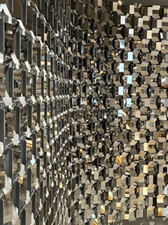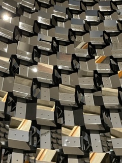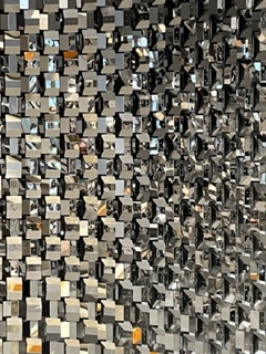 The Everson Museum in Syracuse has a new site specific installation in their stairwell. Derek Porter’s “Faceted Wrap” 2022, consists of 1600 mirrored reflectors.