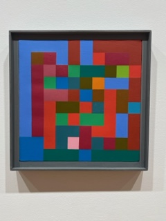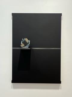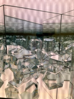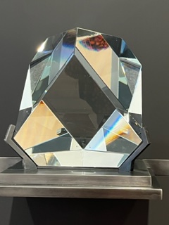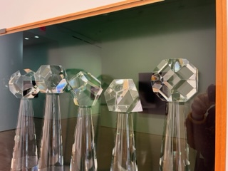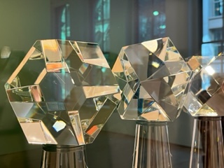 “Prismatic Refractive Geometry I” features a large grouping of the glass prisms in a mirrored display case. The reflection off the irregular faces of the clear forms bouncing off the reflection of the mirrors creates the sense of infinite possibilities.