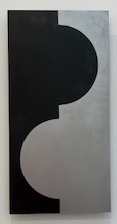 “Black White. Half Rounds” is a hard edge painting from 1957 that features a circle that has been split in two with the semicircles shifted apart along a vertical line. The use of silver and black paint creates an forceful interpretation of the positive and negative space.