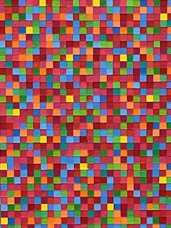 “Random 28 (Red Version)” from 2023 consists on intricately hand painted squares. The vibrant color selection for this tiling makes the work visually pop and sizzle.