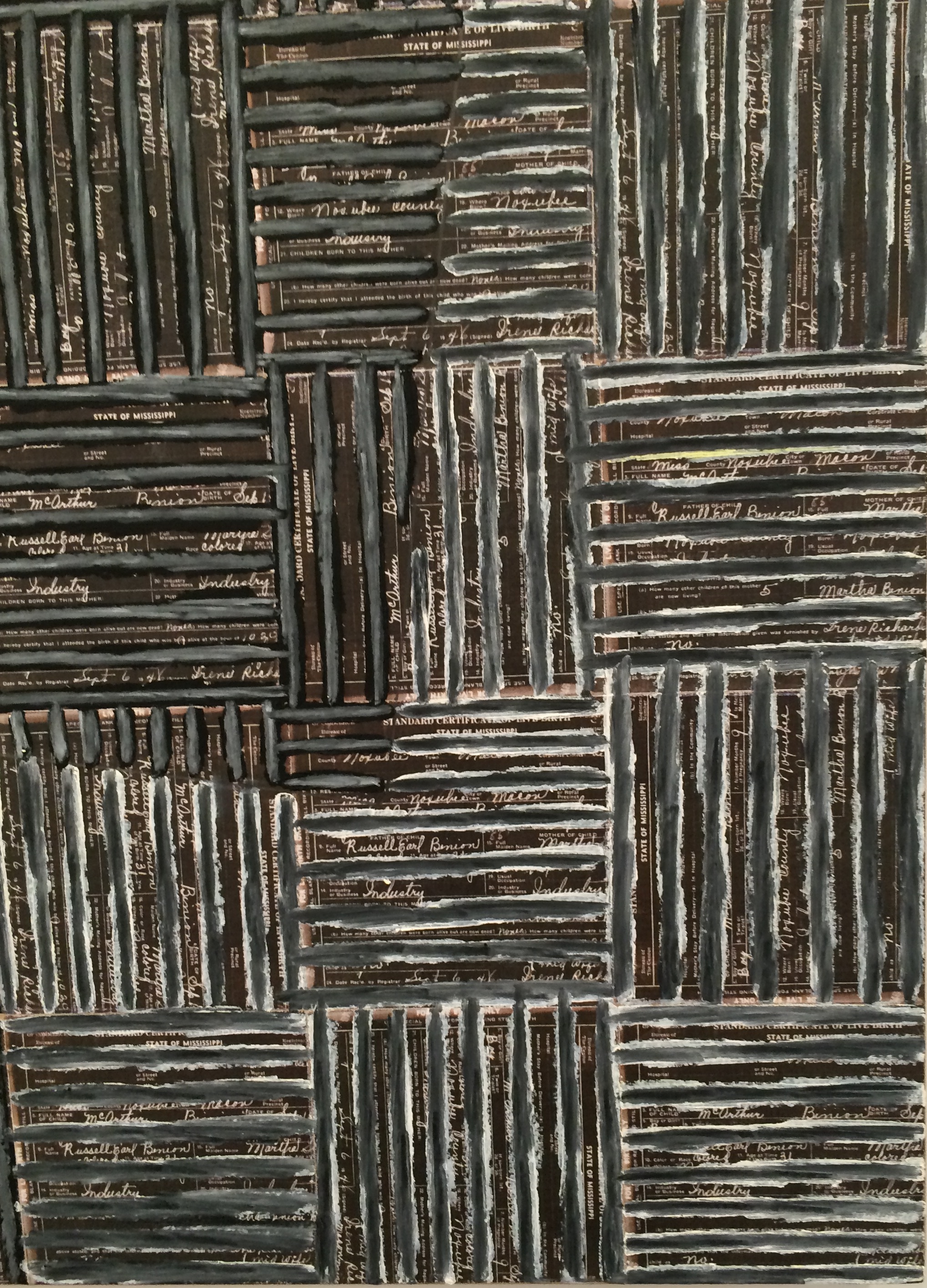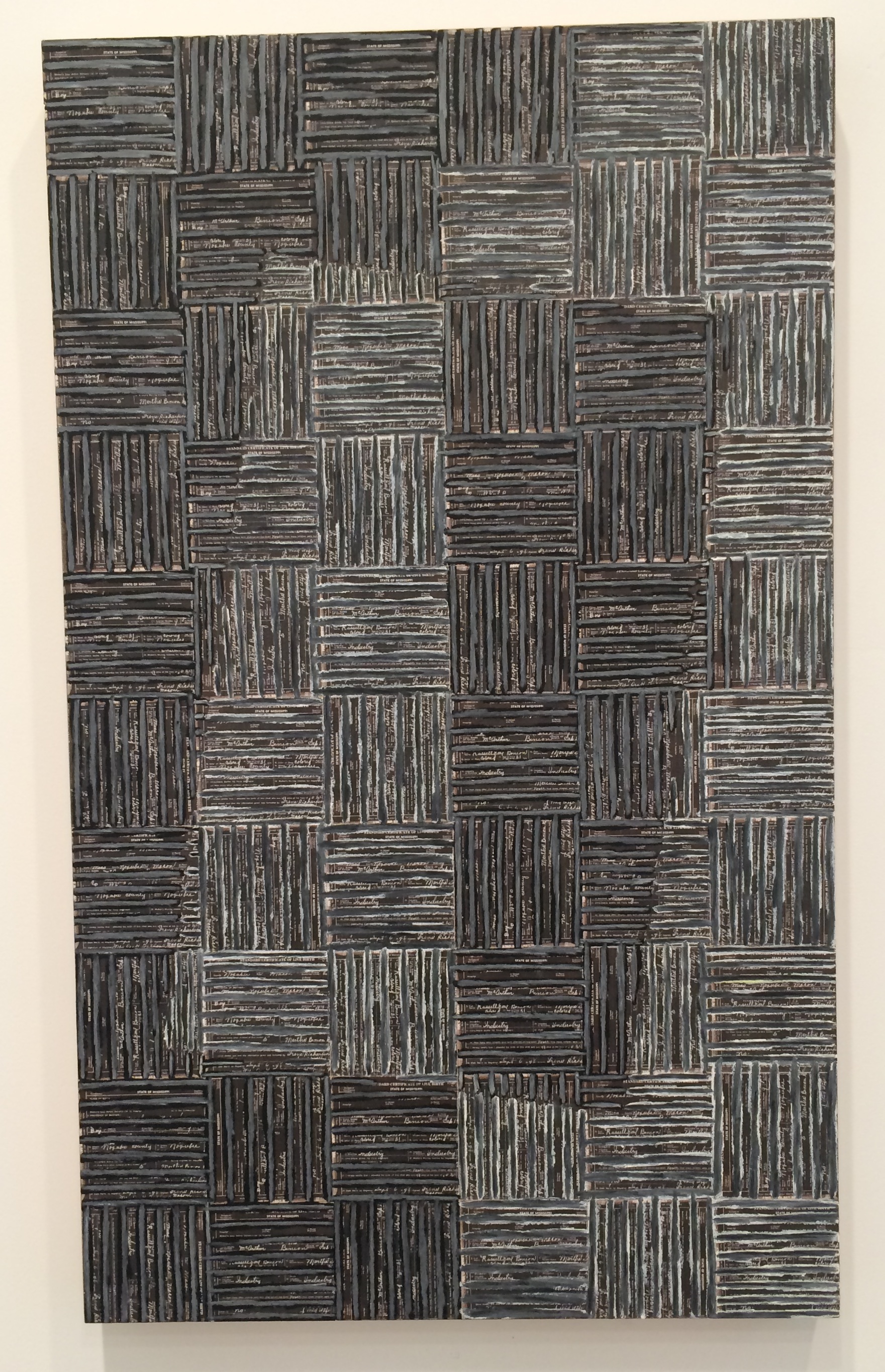 McArthur Binion has an esteemed history working in the realm of abstract art. The exhibition “Re:Mind” at Galerie Lelong features his new work. The artist uses copies of personal documentation, birth certificate, address books, and cuts them down into equal length strips. He mines the textual information from his past. He arranges the strips into vertical and horizontal patterns to create alternating squares within a grid. This becomes the underlying surface over which Binion applies layers of paint stick strokes.