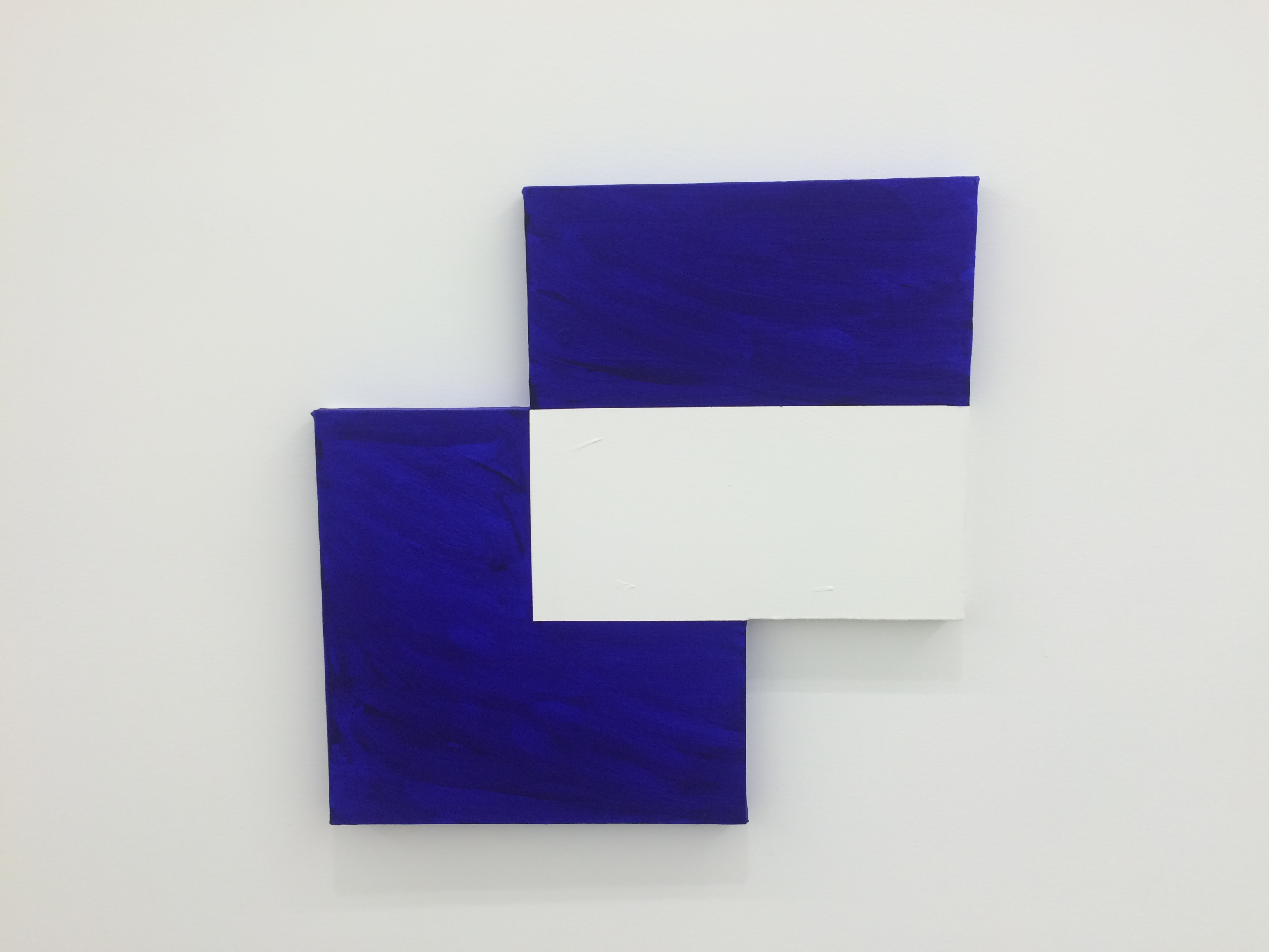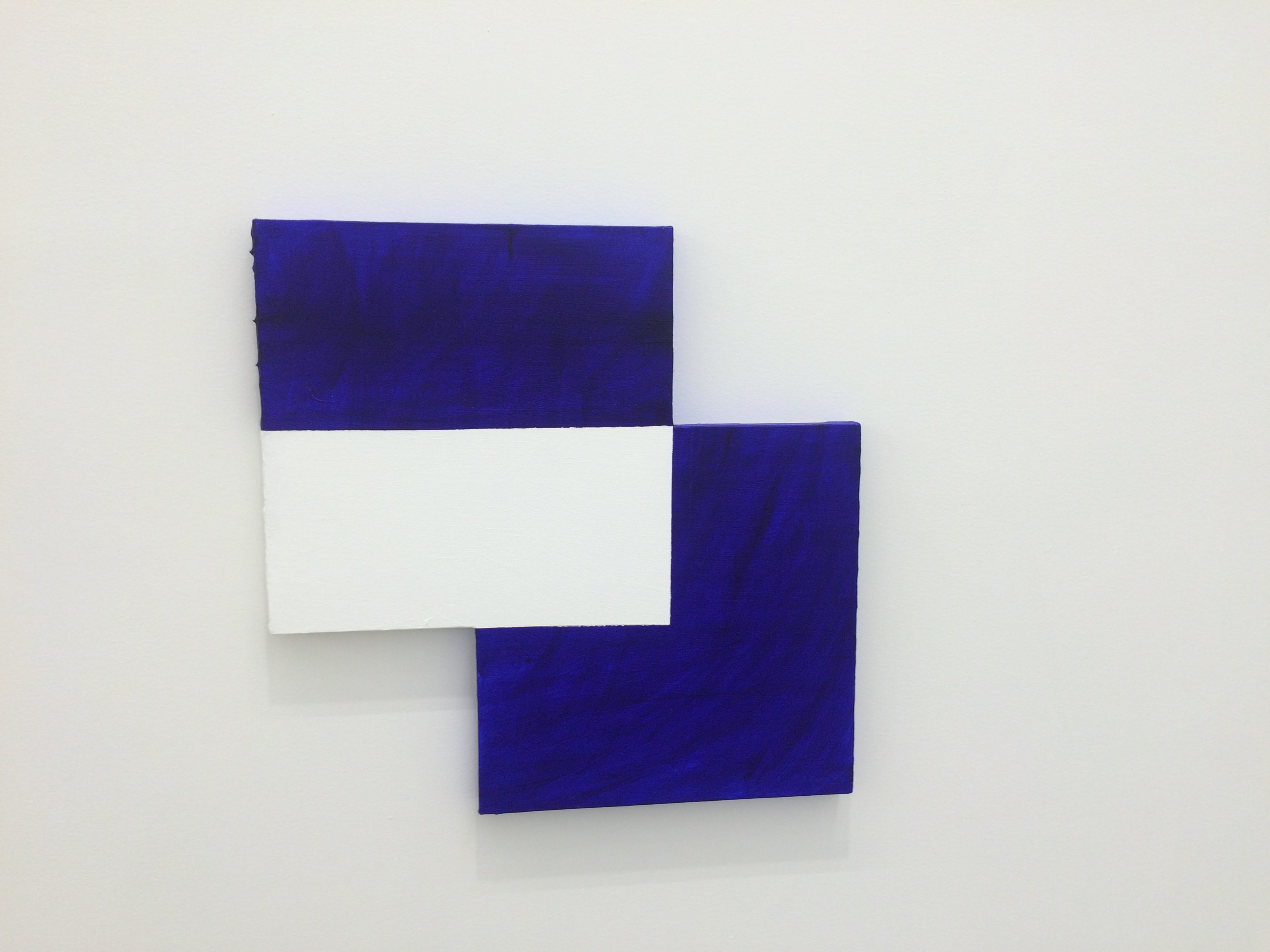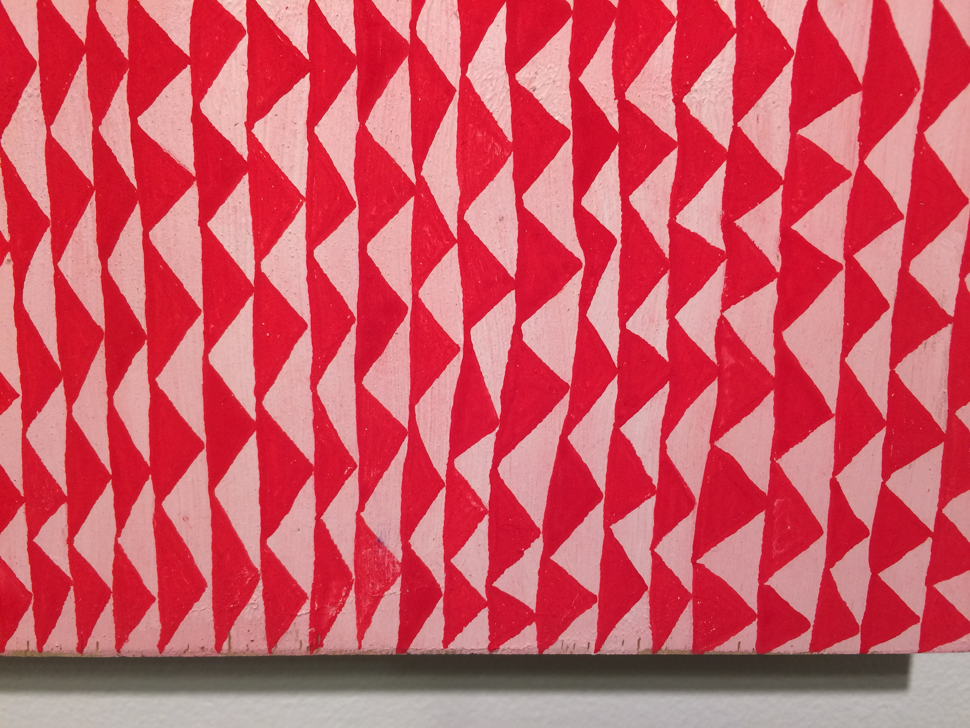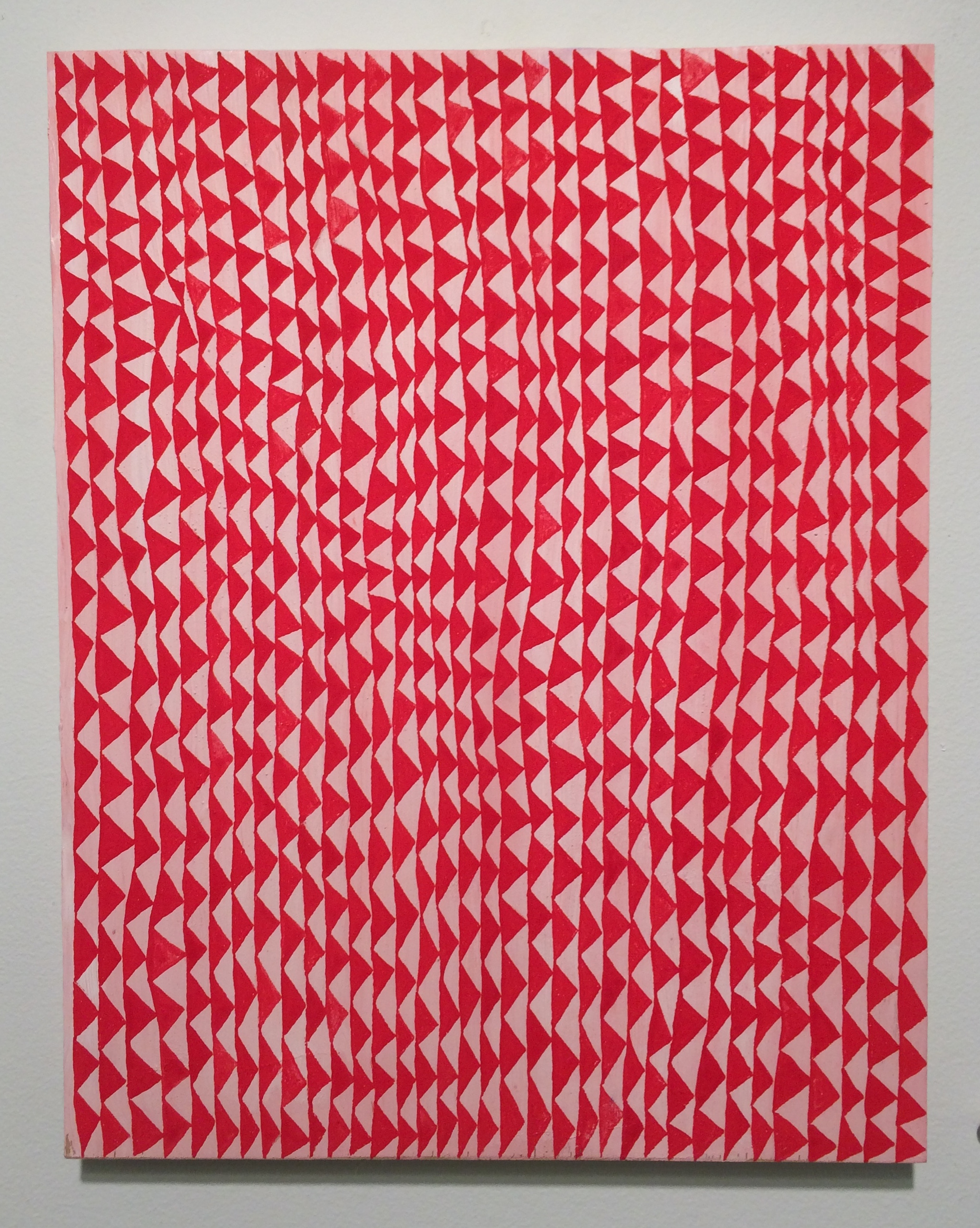This gouache on wood panel from 2015 measures 14 x 11 inches. Its compact format holds a profusion of triangles. The almost parallel columns of almost isosceles triangles are packed tightly on the plane. Alternating the the red and pink shapes, all of the red triangles seem to point right and all pink ones point left. This forms an interesting dialogue between positive and negative space.